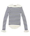 女性らしいフリルデザインを、落ち感のあるパンツとパンプスでスマートにまとめた上品スタイル。