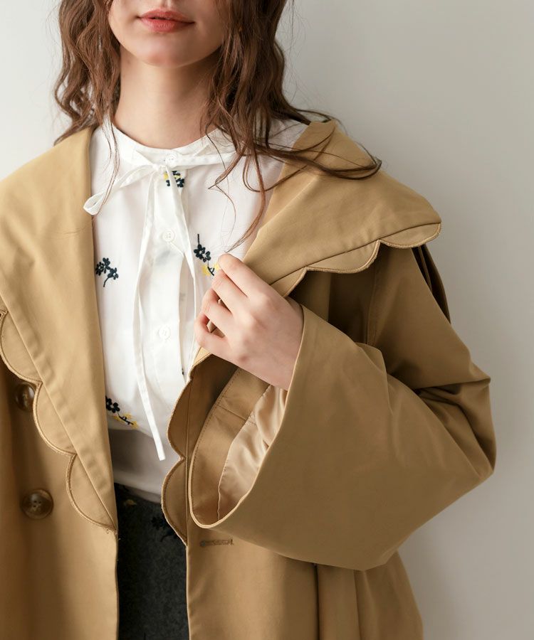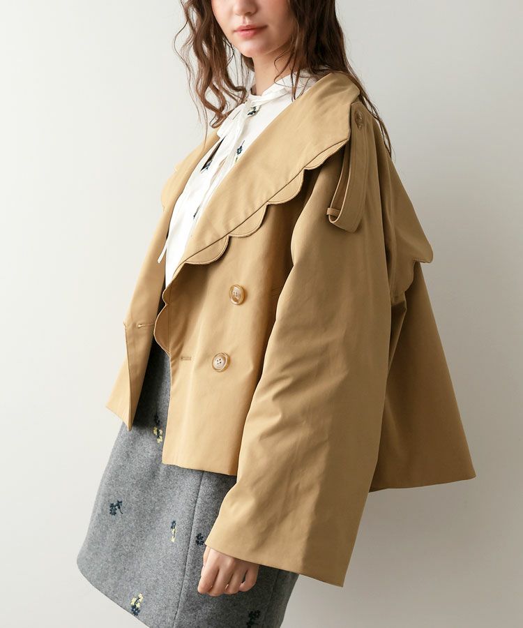 フェミニンさとトレンチのきちんと感を両立させたスカラップショートトレンチ。