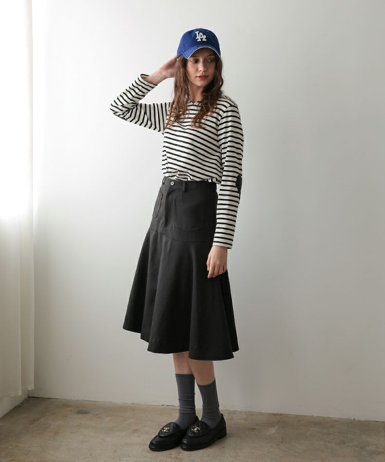 シンプルなブラックベースだから、カジュアルなニットと合わせる時は裾フリルを外して甘すぎず大人可愛いをアクセントに。