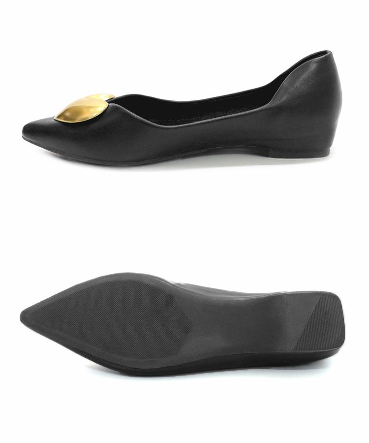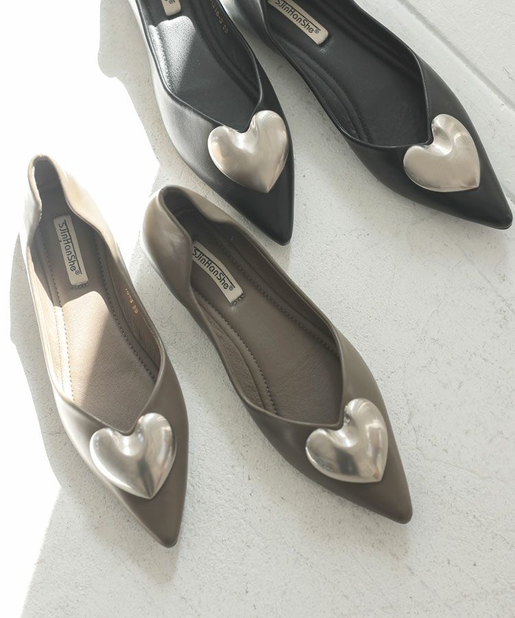 大振りのマットメタルハートが施された大人可愛いフラットパンプス。
