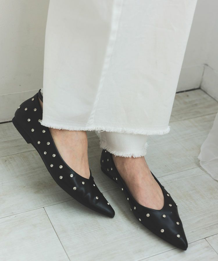 すっきりとしたポインテッドトゥと、ちりばめられたビジュー装飾が足元を華やかに見せてくれる大人美脚パンプス。