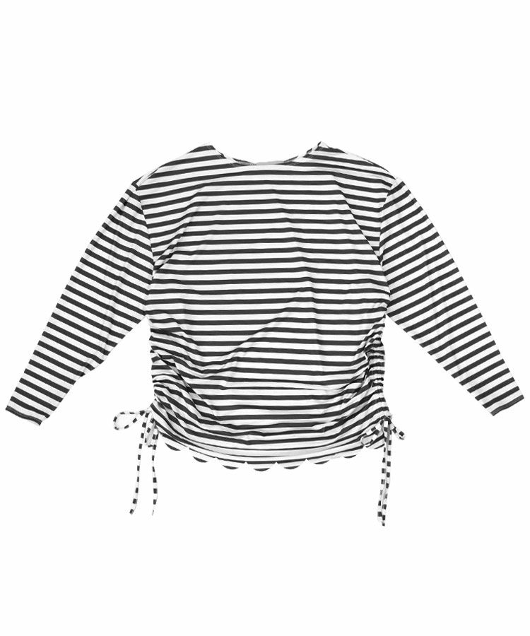 娘がラッシュガードを探していたときに、たまたまインスタライブをされていて、これいいやん!と娘に見せると気に入って購入しました。小学生の息子とプールいくとき私も着ました! 明るい夏らしいブルーのボーダーが爽やかで好きです。黒のスカラップショートパンツにも合いました。
