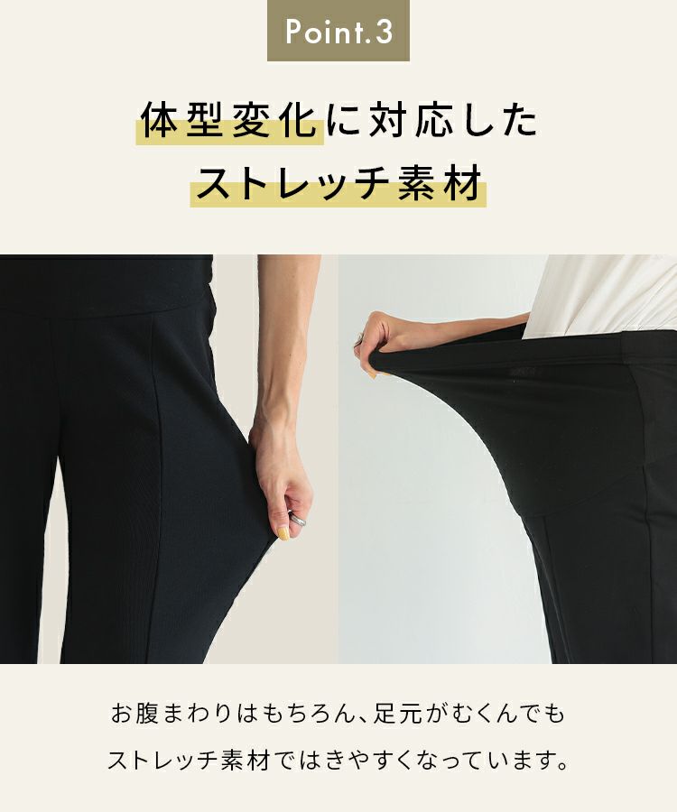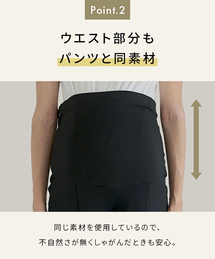 160cm 55kg産後ママです。 ショート丈が丈感ぴったりでした。 産後太りしたままずっと痩せず…。 産前使っていたパンツはことごとくウェストが入らず、困っていました。 もうマタニティではないですが、 こちらのパンツなら、ウェストがゴムなので楽に履けるのでかなりよかったです! マタニティの時に出会いたかった><笑 あと、生地が全然安っぽくないです。 厚め生地なので、今の時期履いても暖かいです☆ 前の縦ラインとスリットが脚長に見せてくれます! これからたくさん愛用します〜〜〜!
