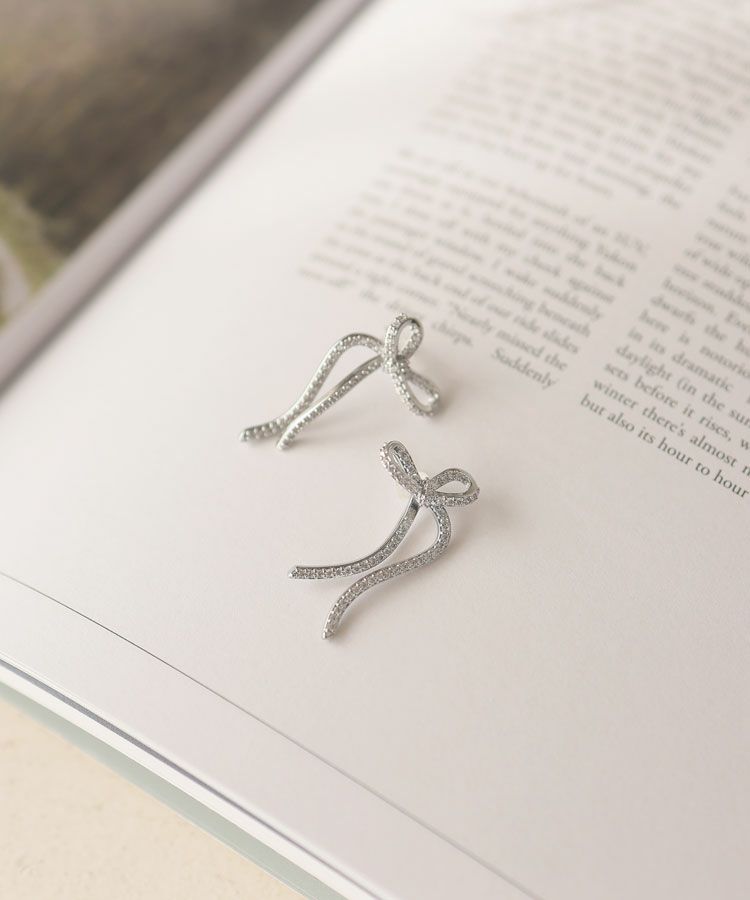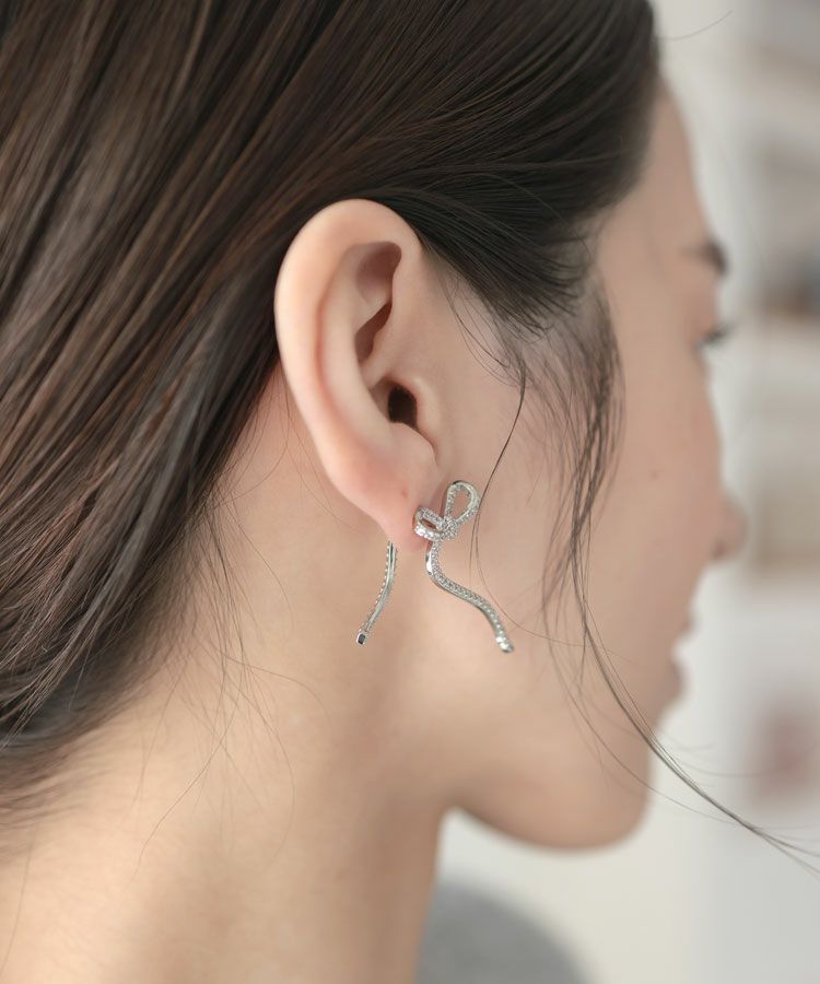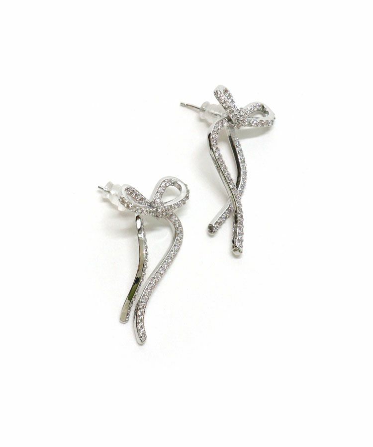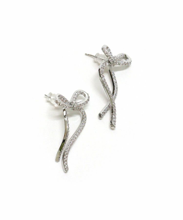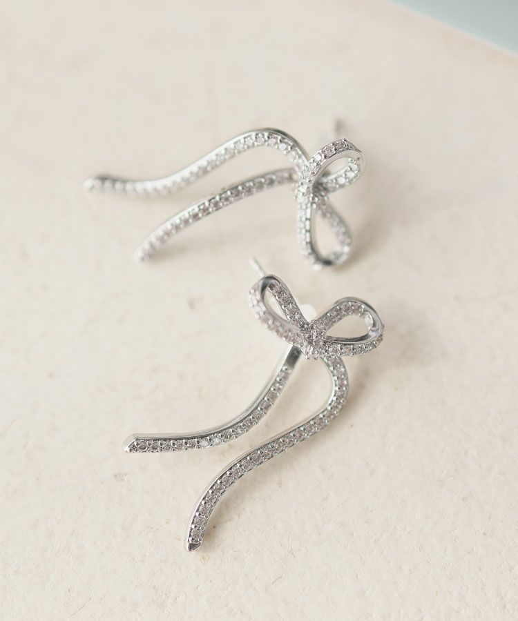 キラキラのビジューをあしらったレディーなシルエットのリボンピアス。