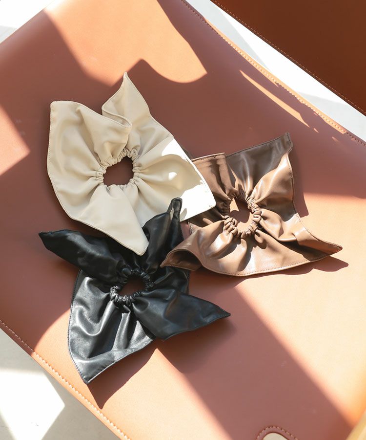 上質なフェイクレザーを使用したスクエア型のボリュームが可愛いシュシュ。