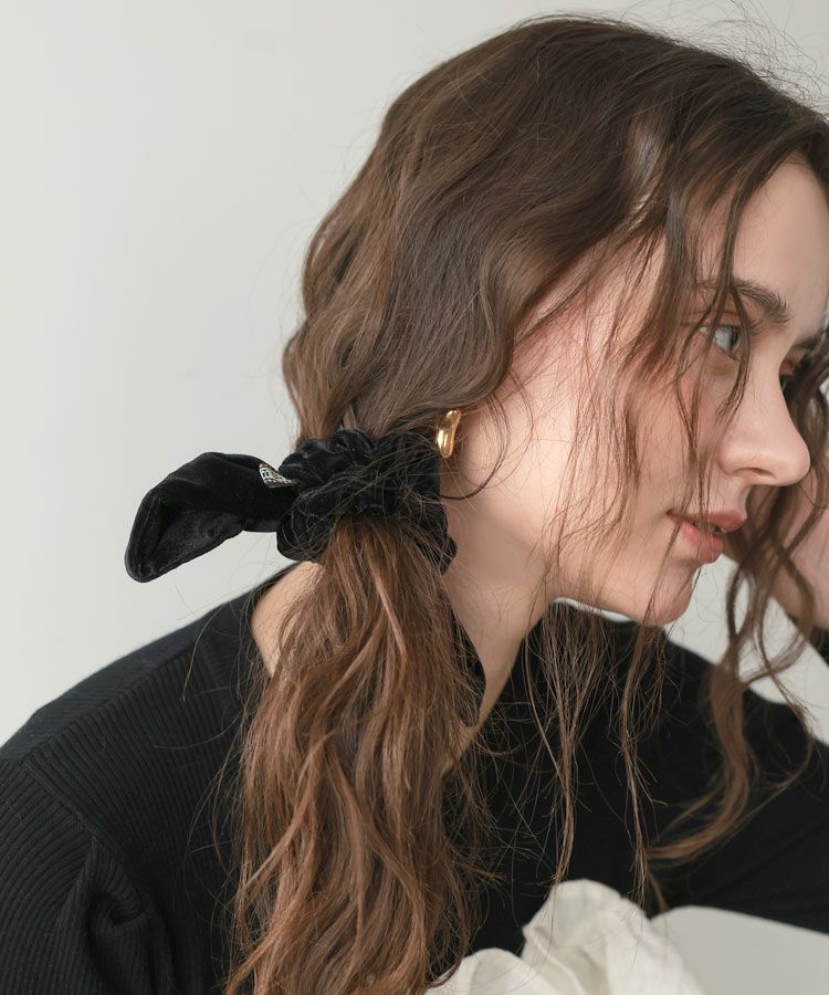 ベロアリボンに、小さめなゴールドチャームが揺れるシュシュ。