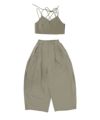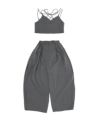ボリューム感たっぷりのコクーンワイドパンツと、コンパクトなビスチェの組み合わせ。