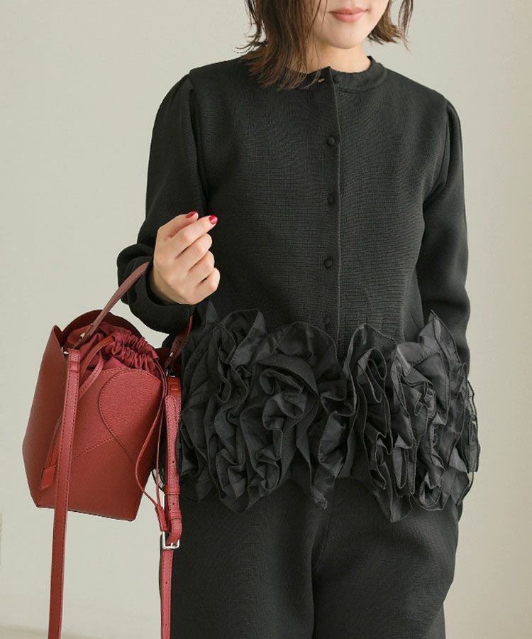 フリルをふんだんにカーディガン、ボトムスに取り入れたDonobanらしい大人ガーリーに仕上げました。