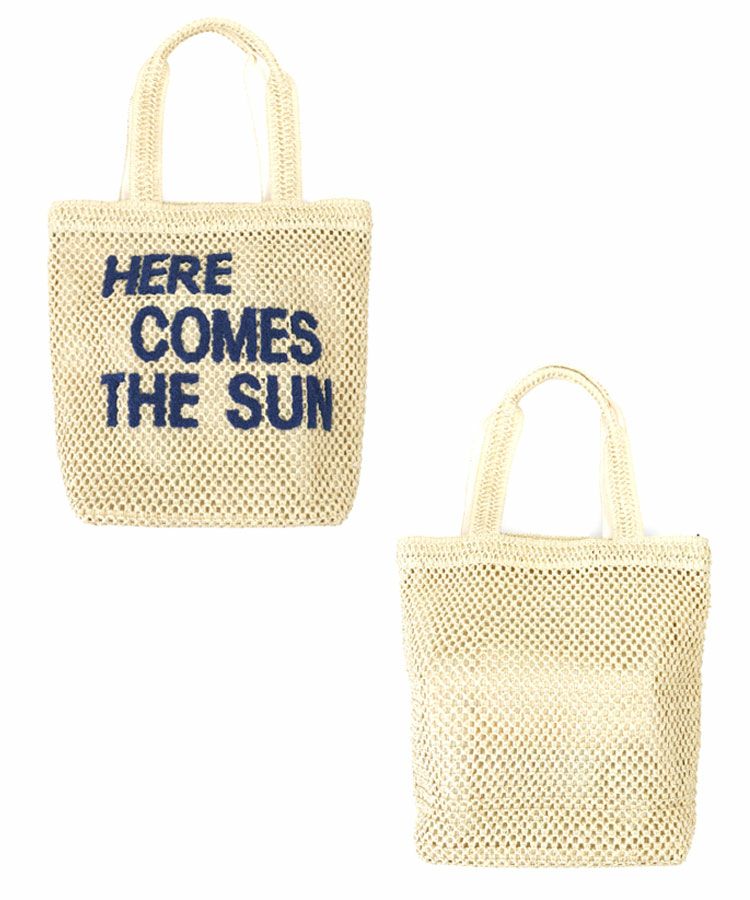 夏に持ちたいラフィア風素材に「HERE COMES THE SUN」の刺繍がデザインのアクセントになったトートバッグ。