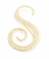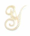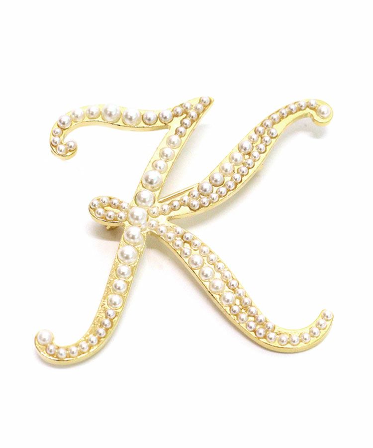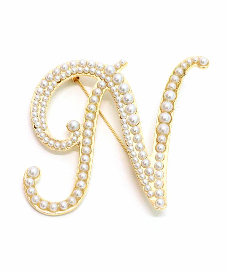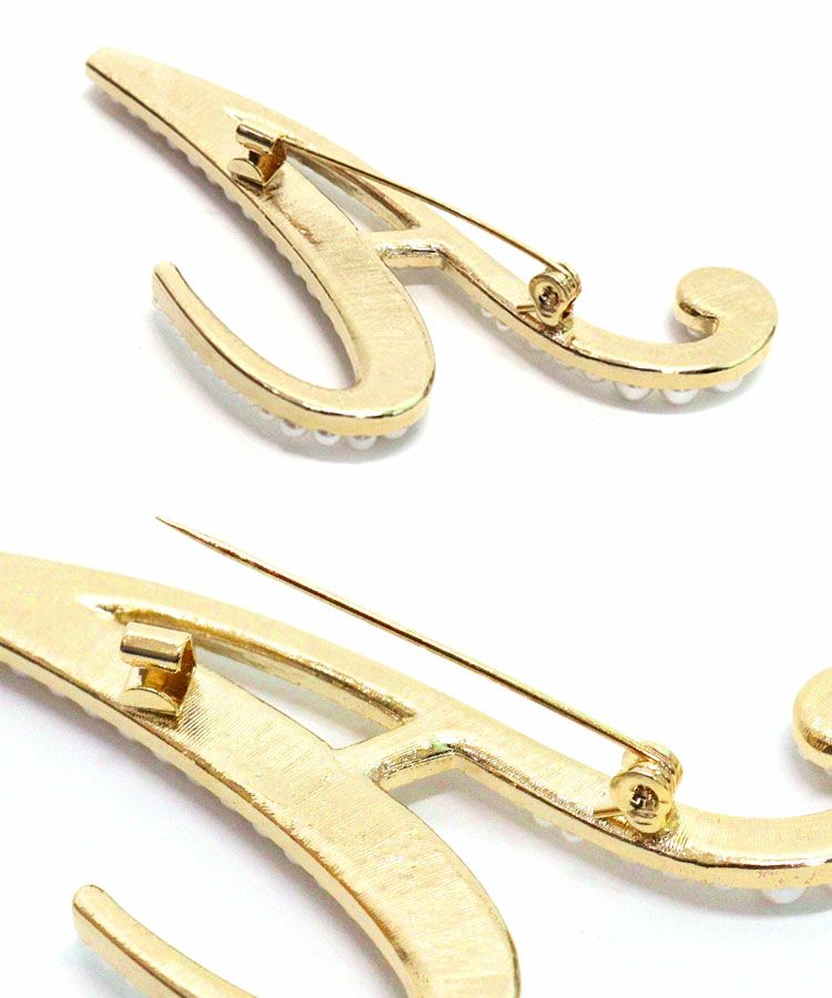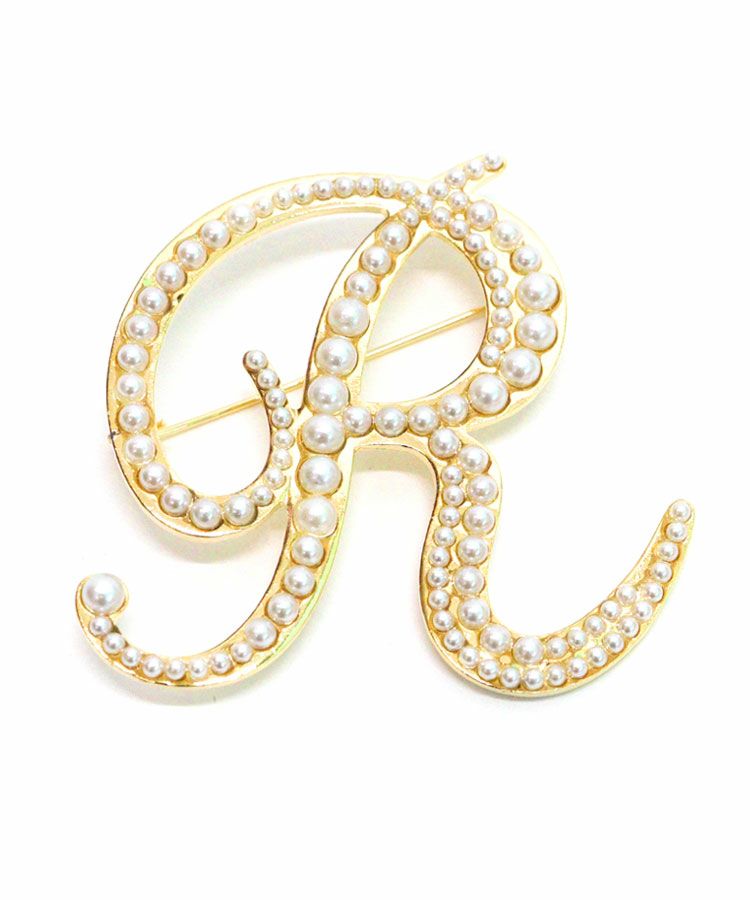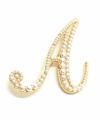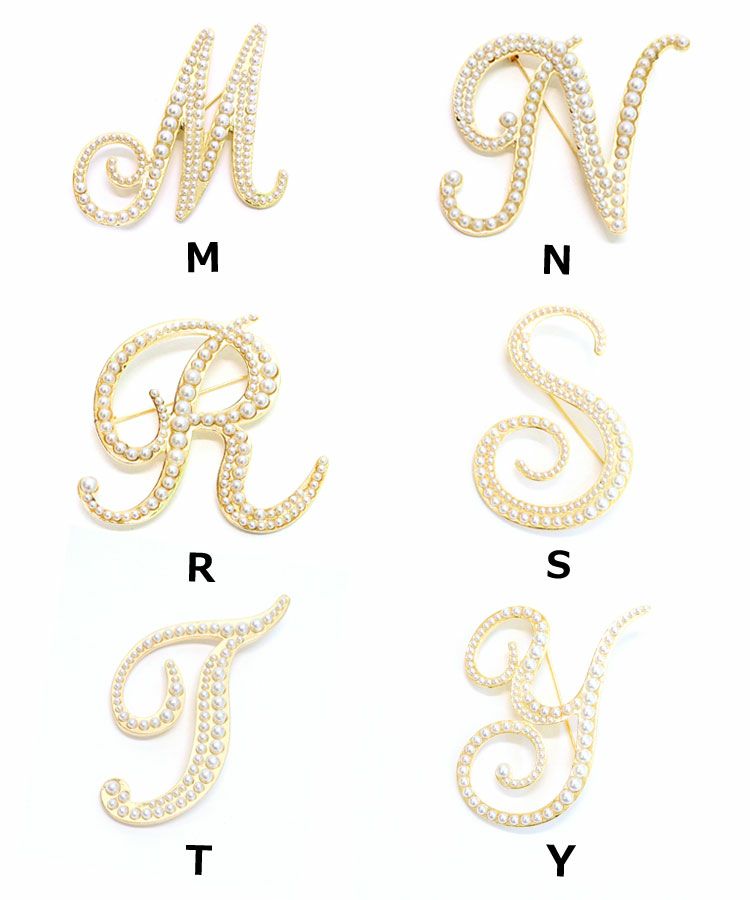 アルファベットに小さめのパールと大きめのパールが施された、エレガントなデザインのパールブローチ。
