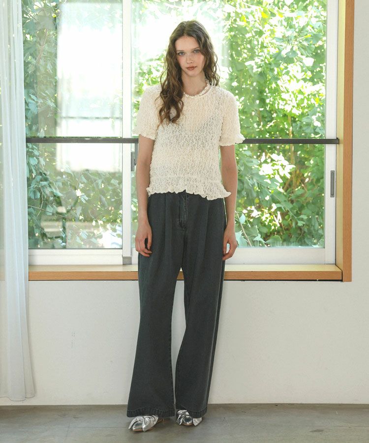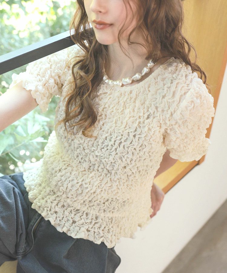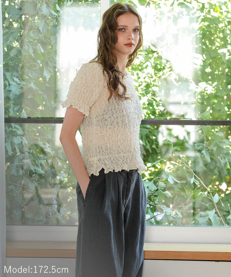新作のシアーシャーリングトップスが程よくフェミニンなムードを出してくれ、ギンガムのボトムスと合わせることで、甘すぎず大人可愛いバランスに。休日のお出かけにもぴったりなスタイル!