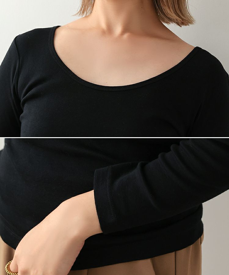 襟ぐりが少し広く深めに設計しているので、どんなトップスにも合わせやすいので寒い時期のインナーとしてオススメです。
