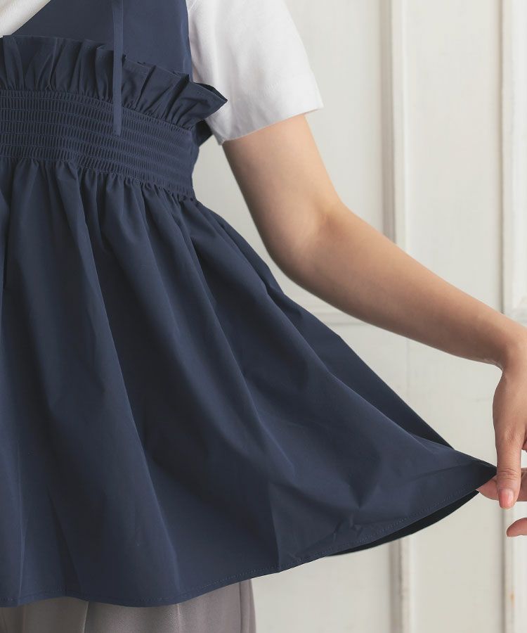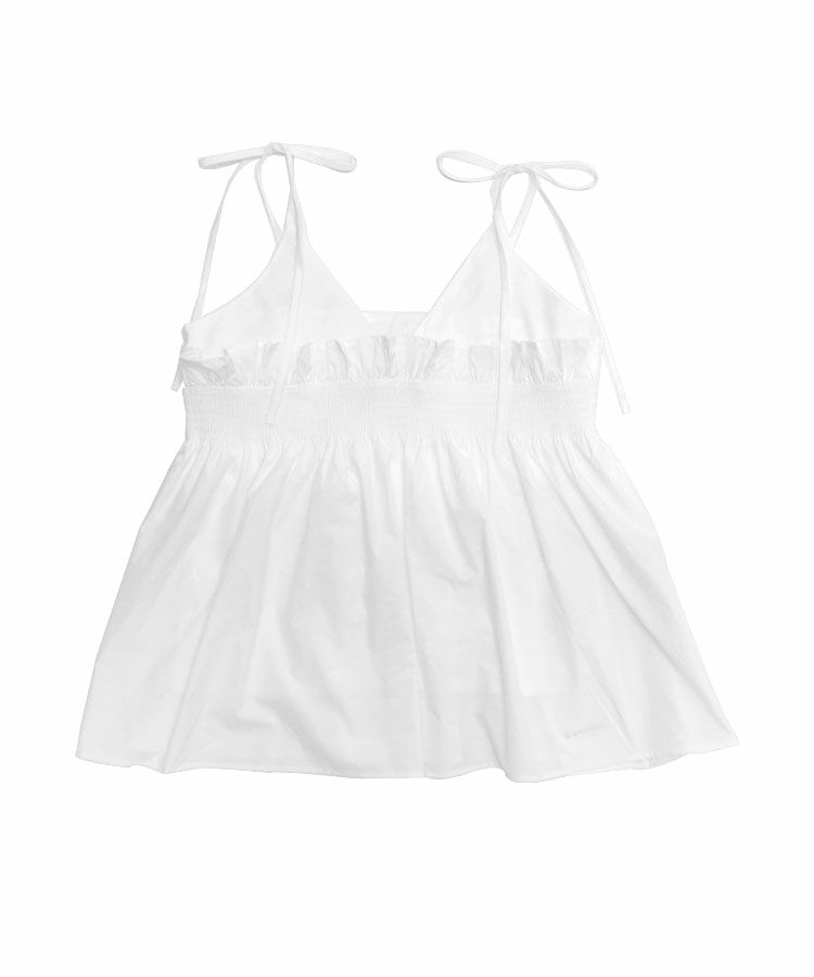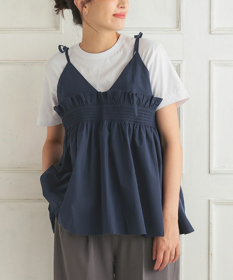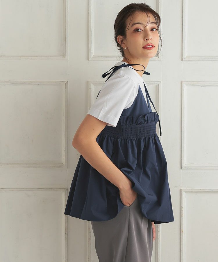 フリルとギャザーにペプラムシルエット、肩紐にリボンが付いた華やな映えるトップス。