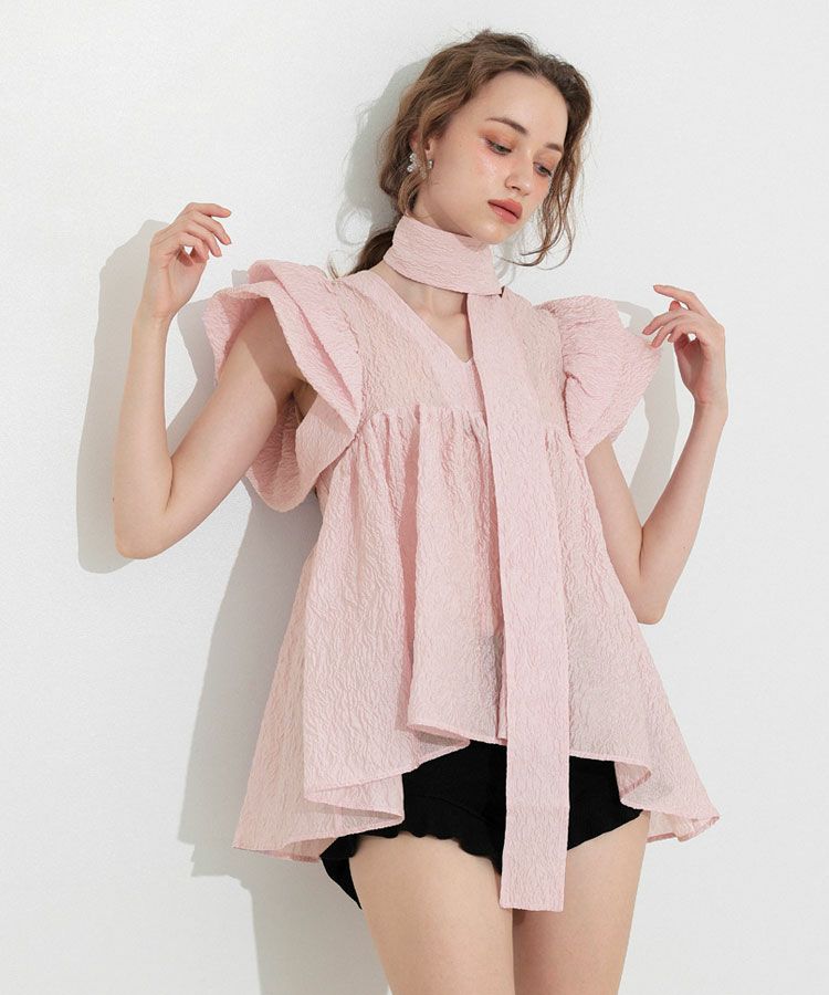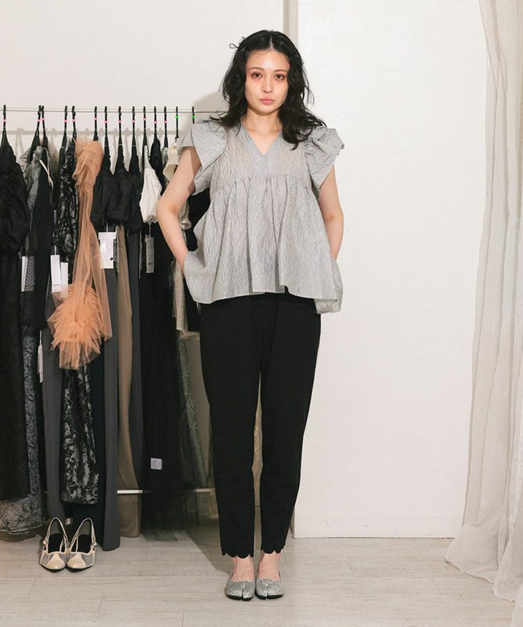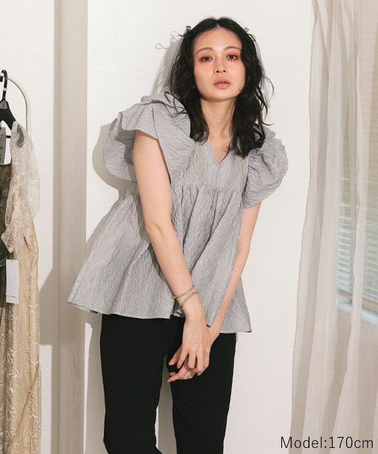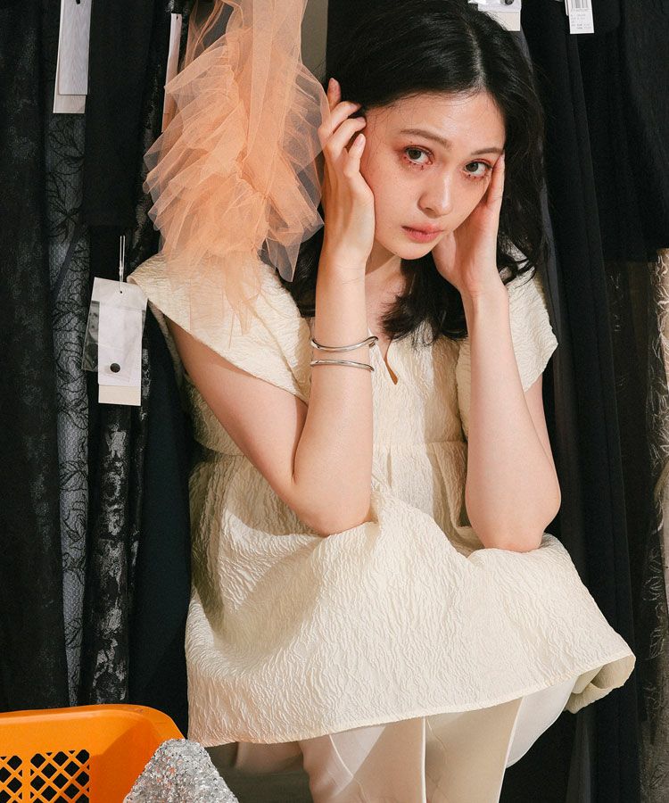 肩まわりのボリュームが印象的かつ、顔まわりの華やかさを引きたてます。