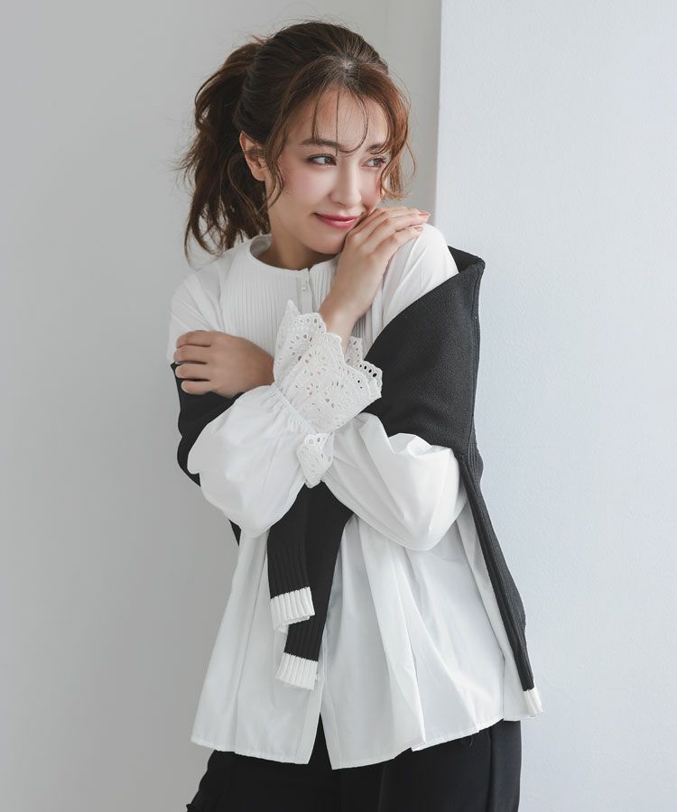 パールボタンと袖にレースをプラスした大人可愛いアイテムに仕上げました。
