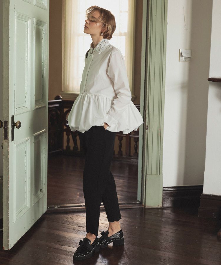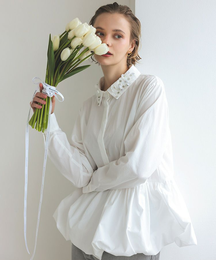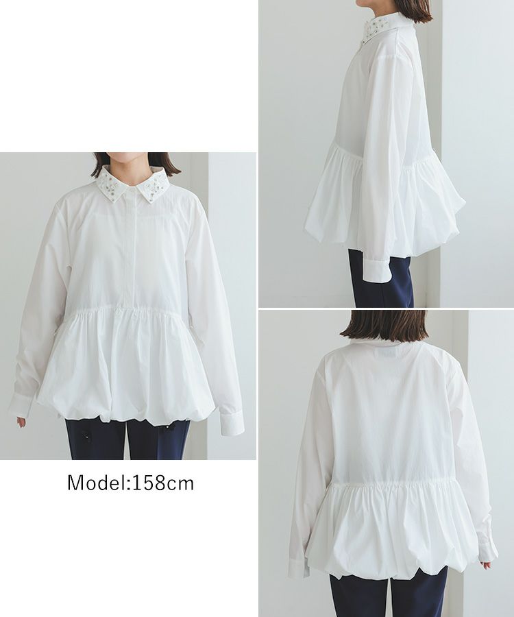 裾がバルーンになっているのと襟にビジューが付いているのが華やかでノーアイロンなのもお気に入りです。
