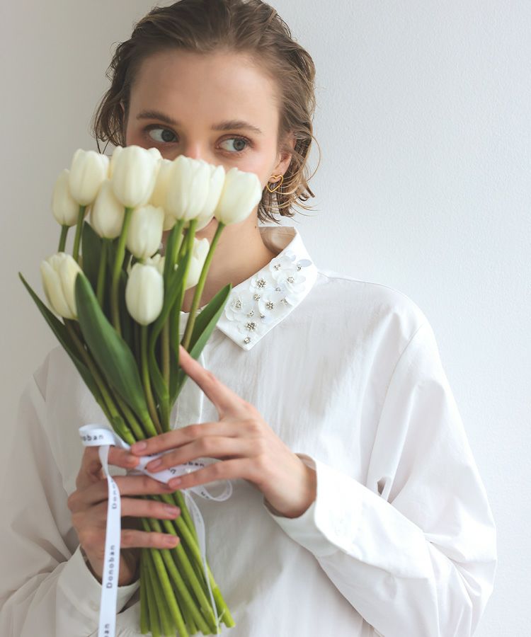 襟デザインは今年らしいフラワーのキラキラビジューが華やかなブラウス。