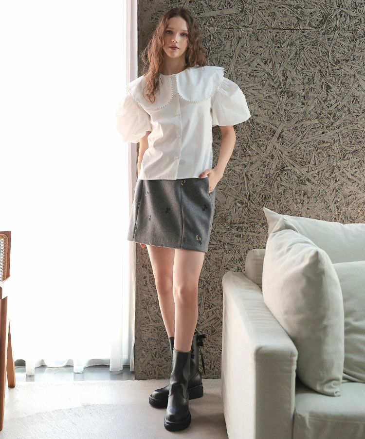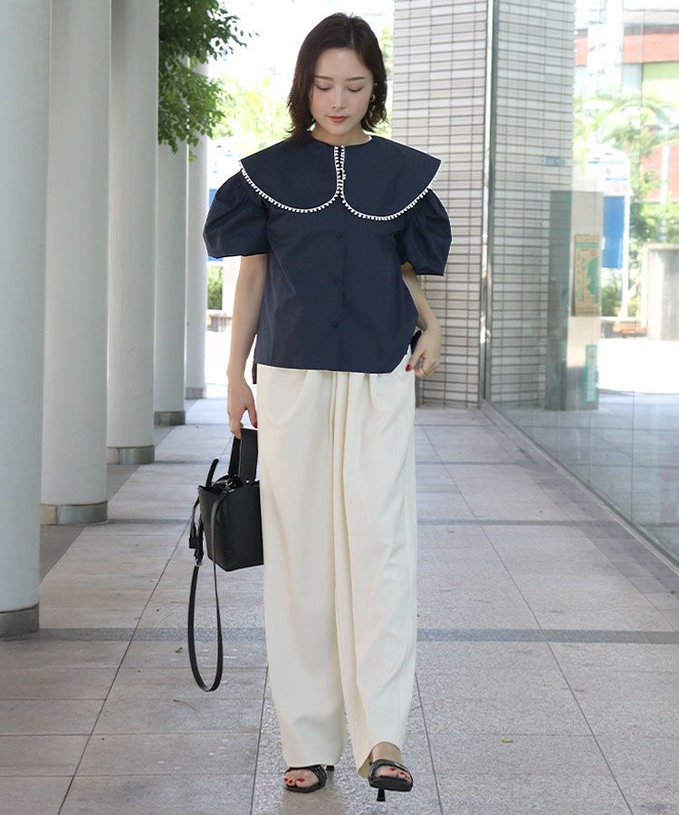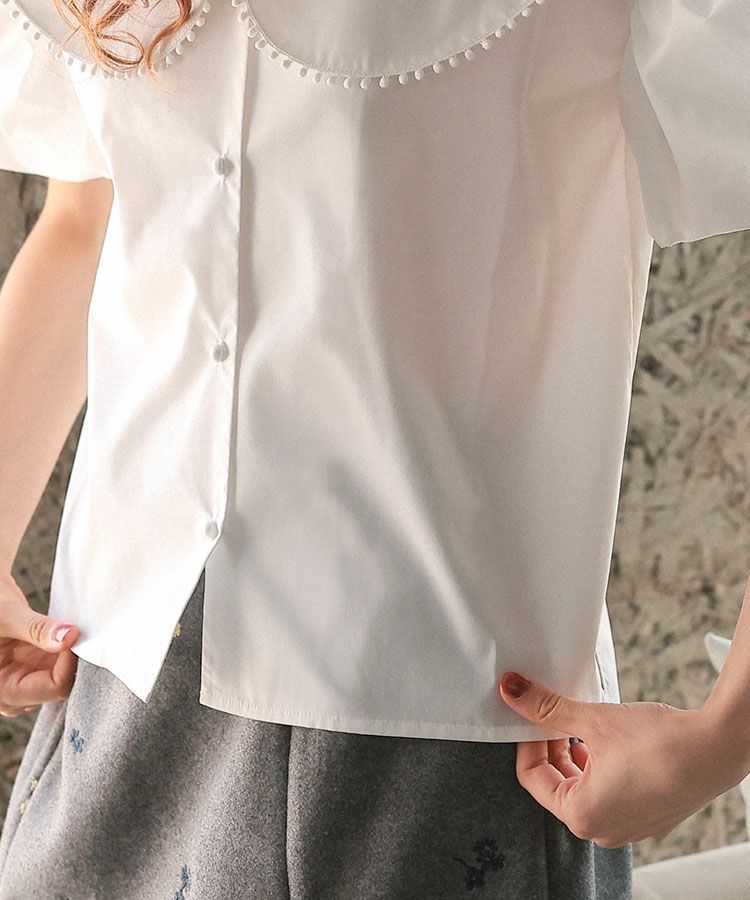 程よくハリ感のある生地感が清楚感と華やかさを演出し、襟の縁には小さなポンポンレースをあしらい可愛さをプラス。