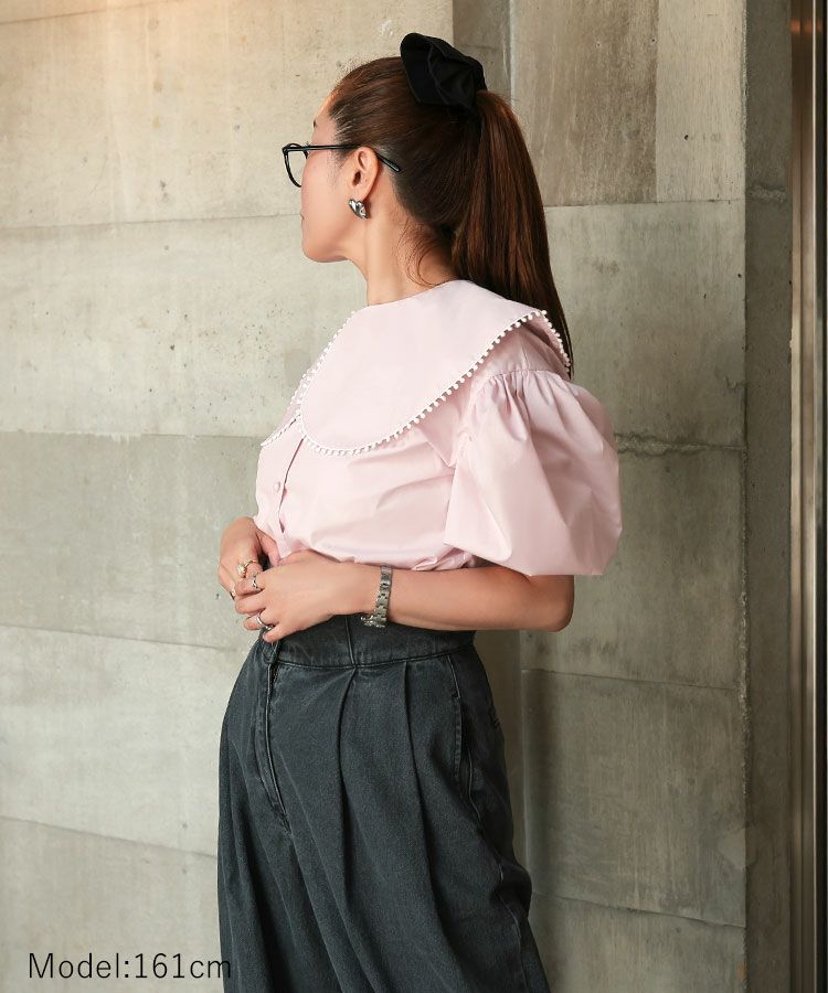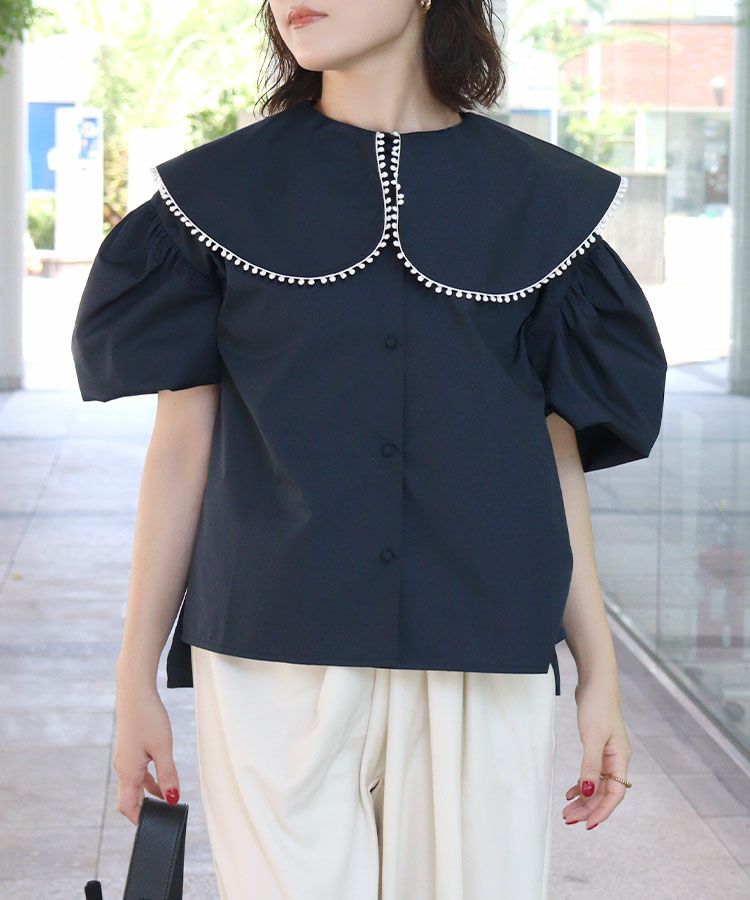 ふんわりとしたパフスリーブと、立体感あるビッグカラーに可愛いポンポンが印象的なブラウス。