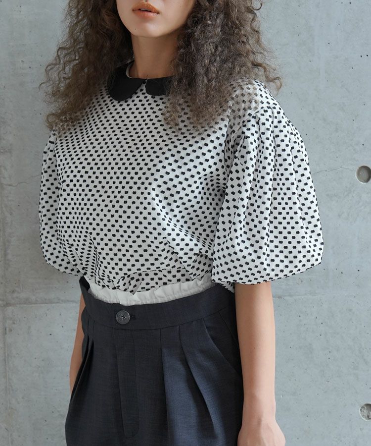 オシャレなドット柄のブラウス。ふんわりとしたアームと、バイカラーの襟がポイント。ずっとヘビロテなカーブデニムは、どんなトップスも更にオシャレ度を上げてくれます。