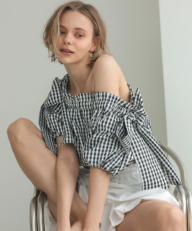 甘めのチェックのトップスにデニムを合わせることで甘すぎないカジュアルなコーデにしました。シャツはリボンで調節可能ですが、中にゴムも入っているのでズレにくく、肌見せを楽しむことができます。