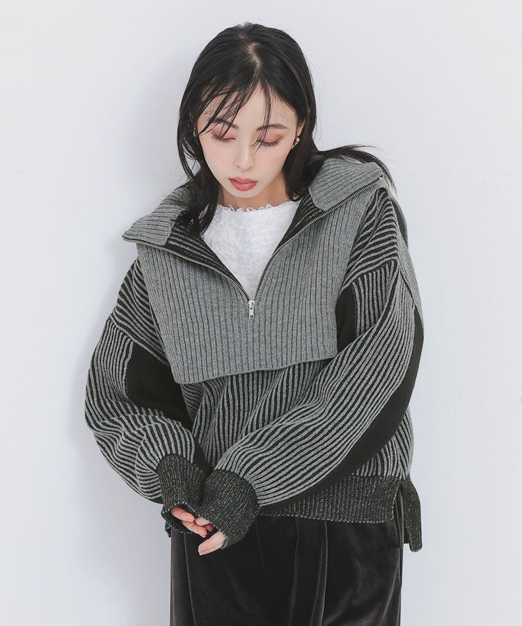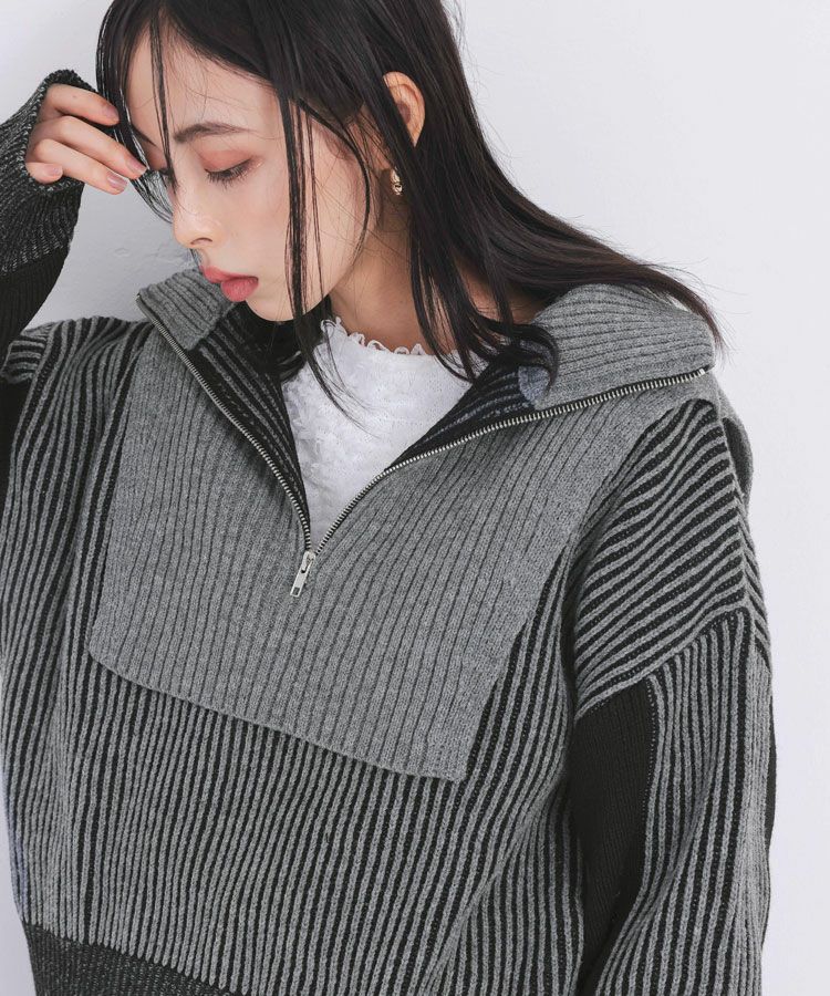 ストライプ調の柄デザインとネックウォーマーを重ねたようなデザインが目を引くオシャレニット。