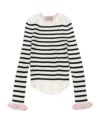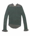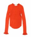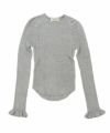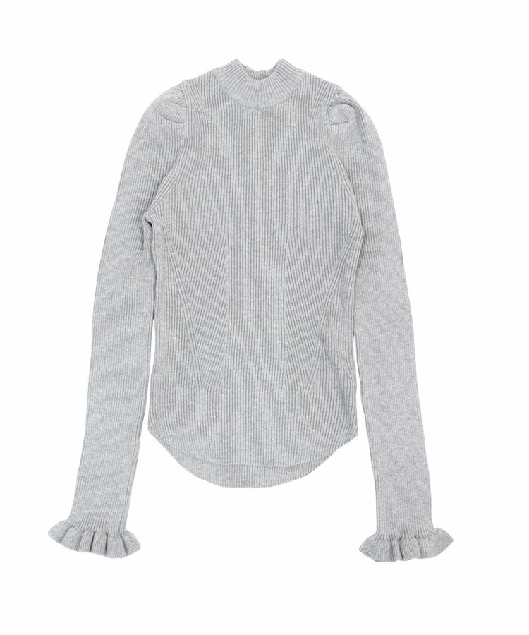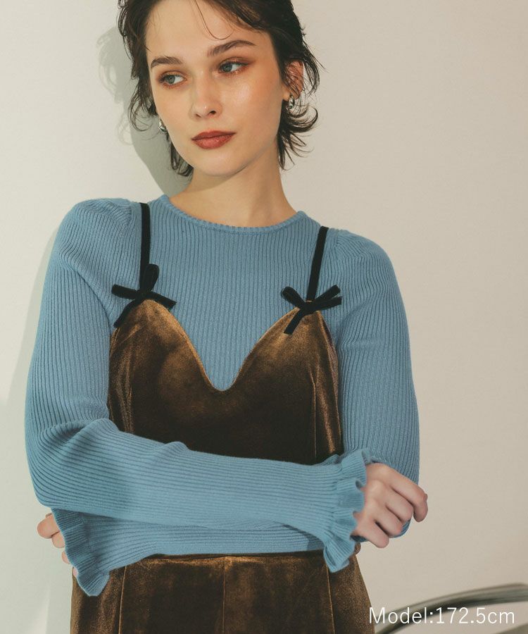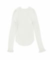 女性らしいフリルデザインを、落ち感のあるパンツとパンプスでスマートにまとめた上品スタイル。