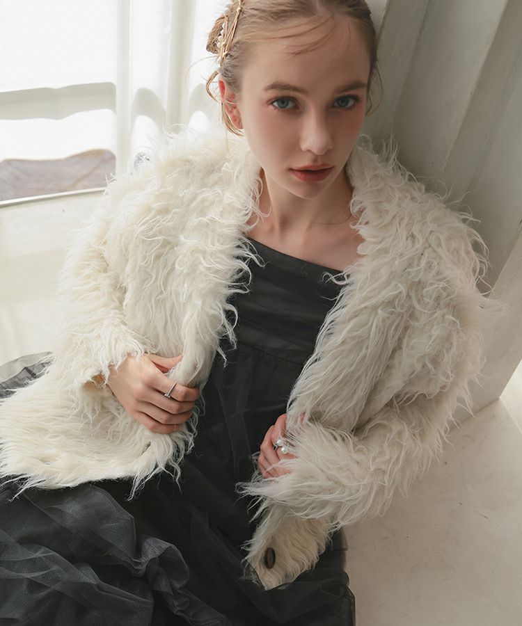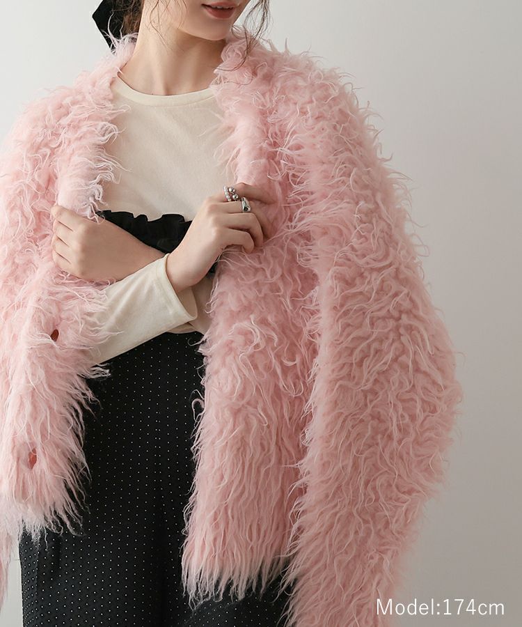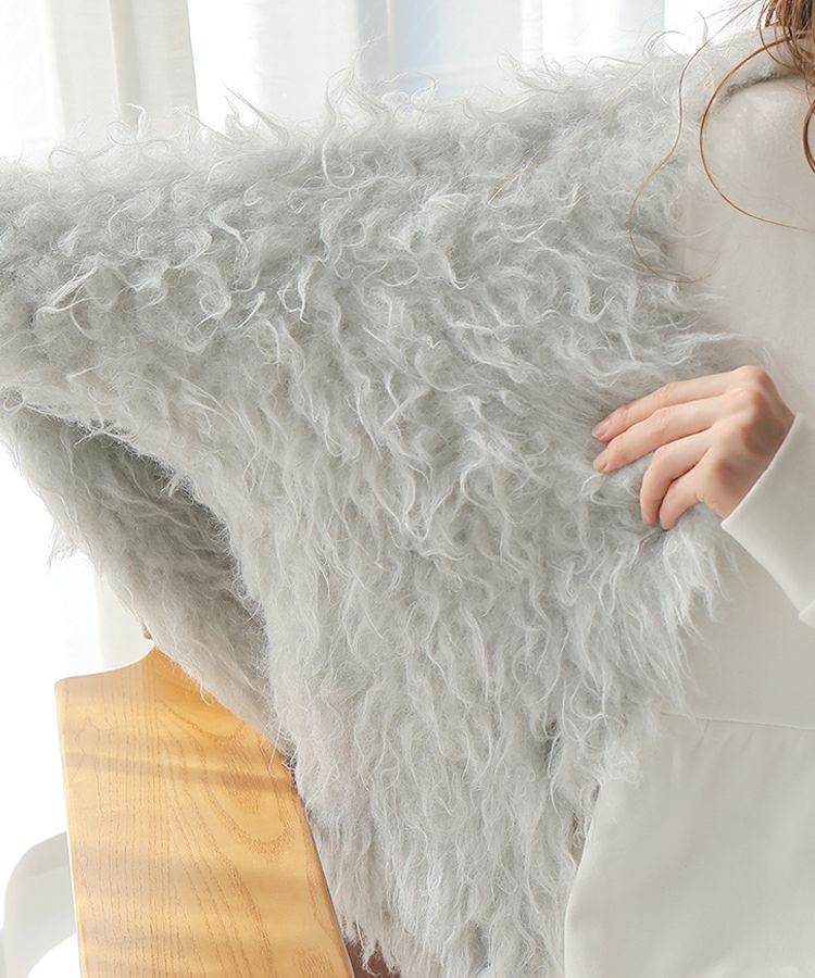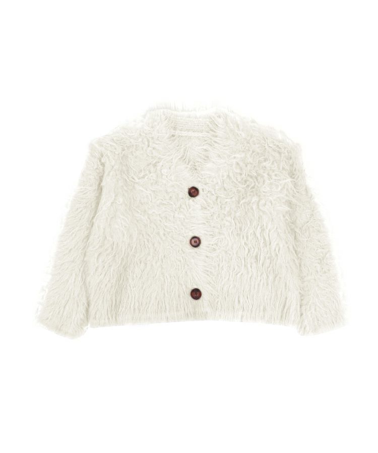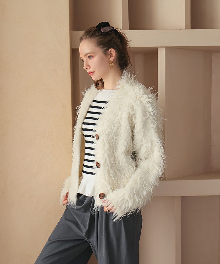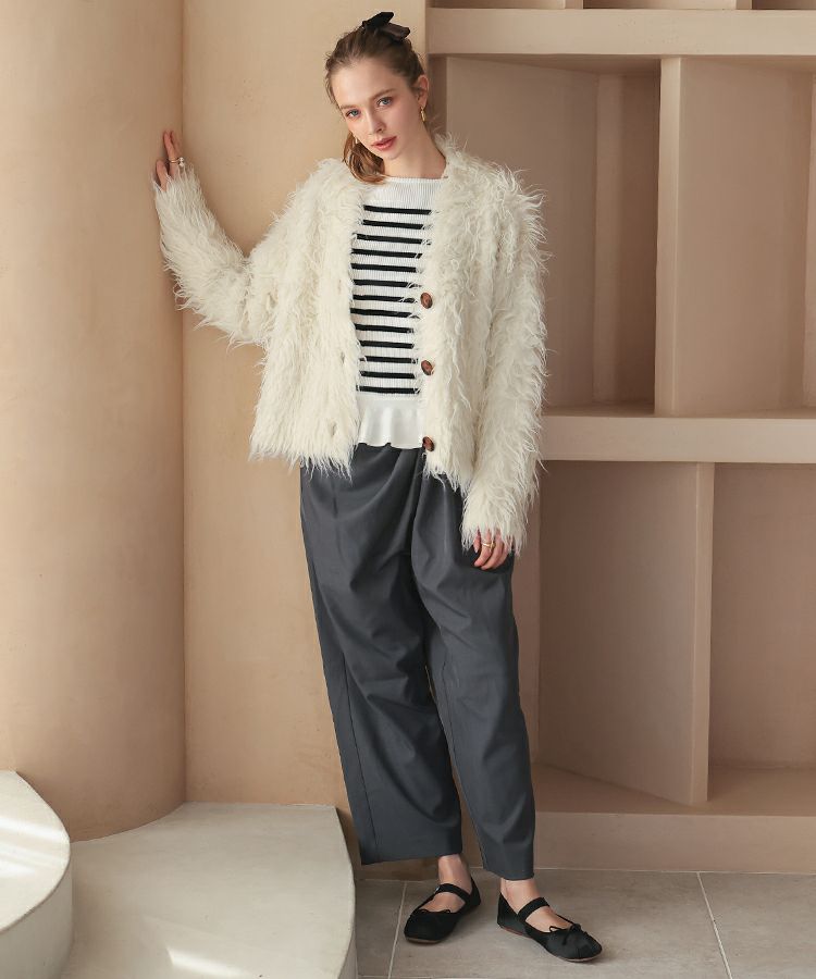 羽織るだけで柔らかなムードを纏えるフラッフィーカーディガンに、ゆるっと落ち感のあるリブニットが好相性。スラッとしたラインに余裕のあるシルエットが◎