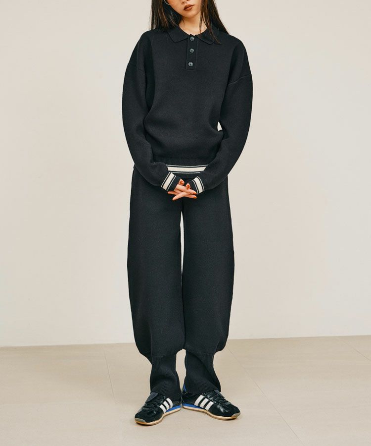 綺麗めボトムにスカートに、カジュアルデニムとコーデ幅も広く、同素材のリブヘムニットパンツのセットアップコーデもおすすめです。
