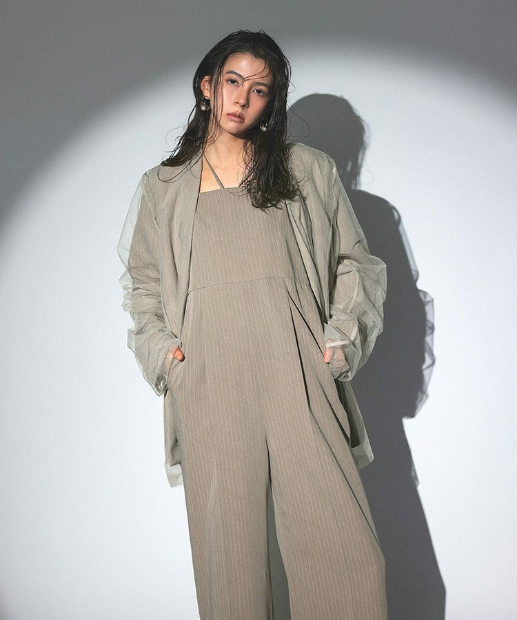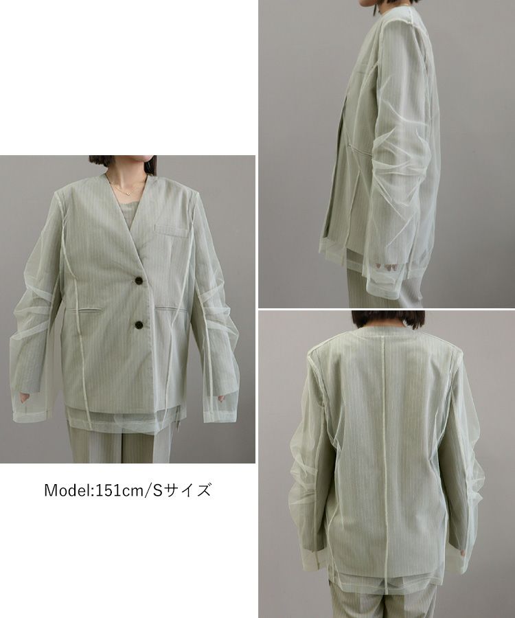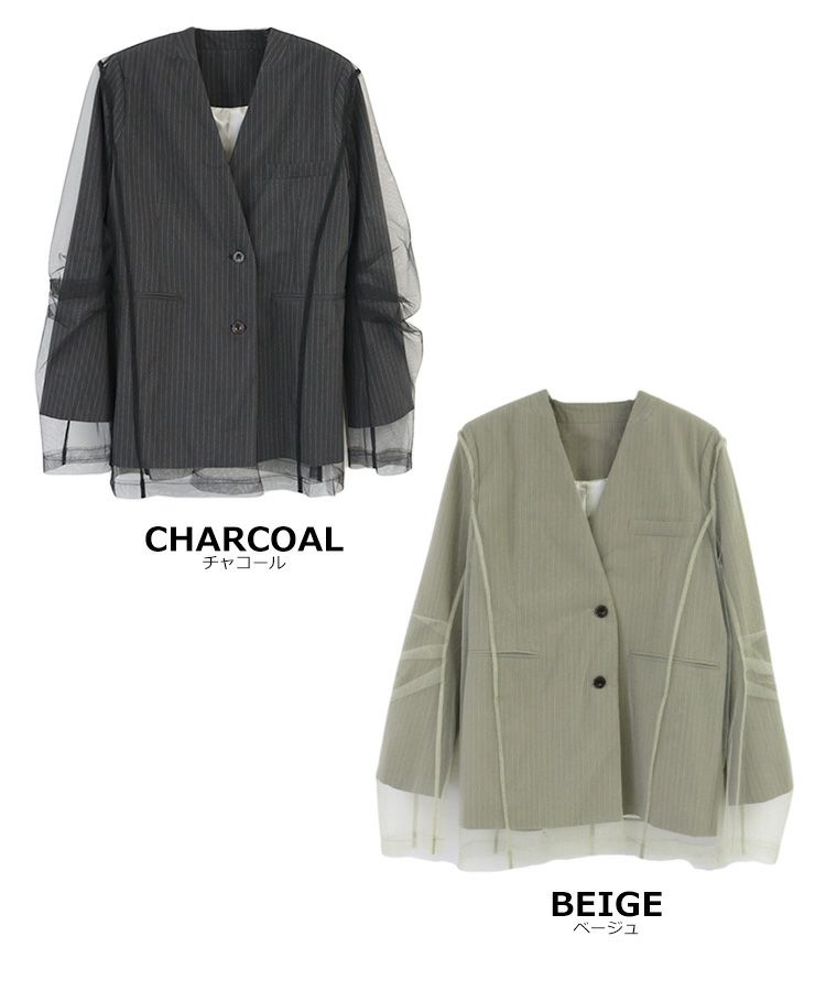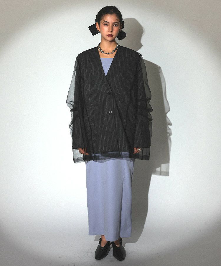 ポリエステル×レーヨンのピンストライプ素材とハリ感のあるチュール素材をレイヤードした、ボクシーなカラーレスジャケットです。