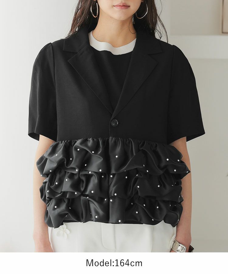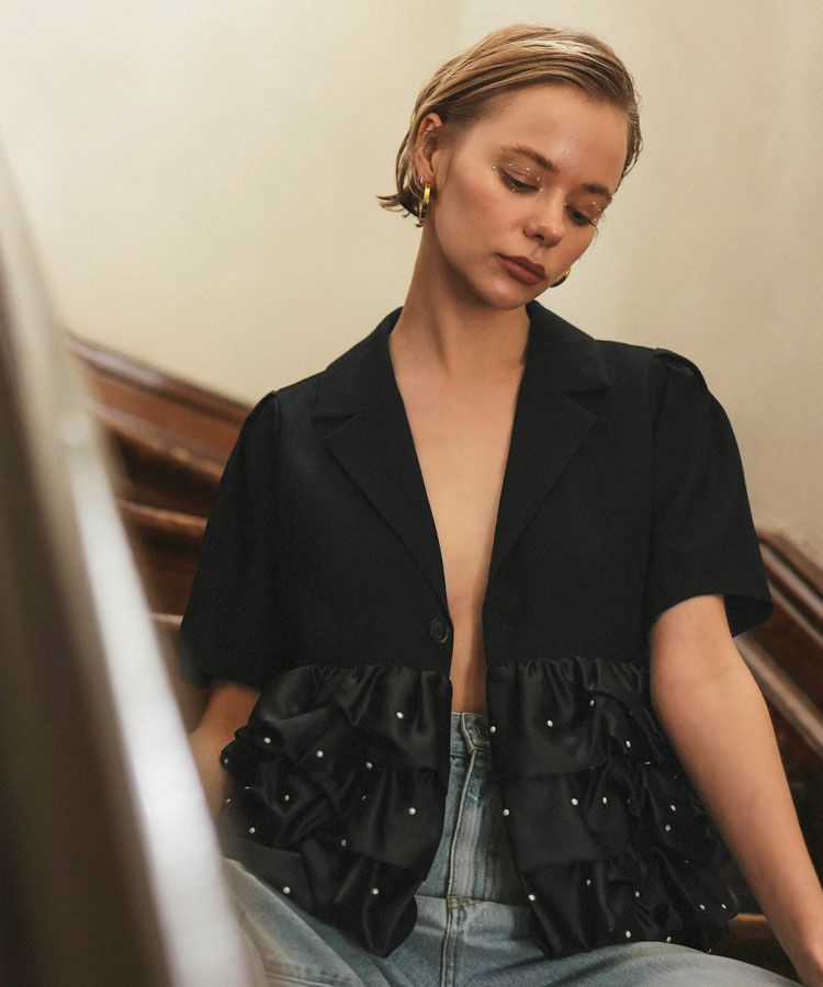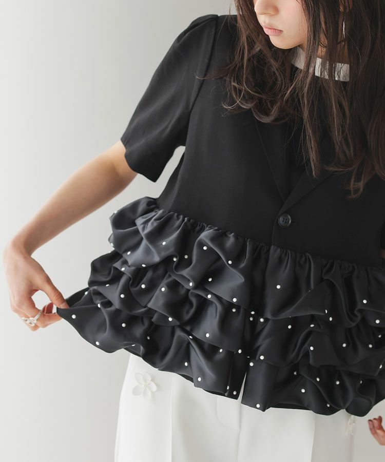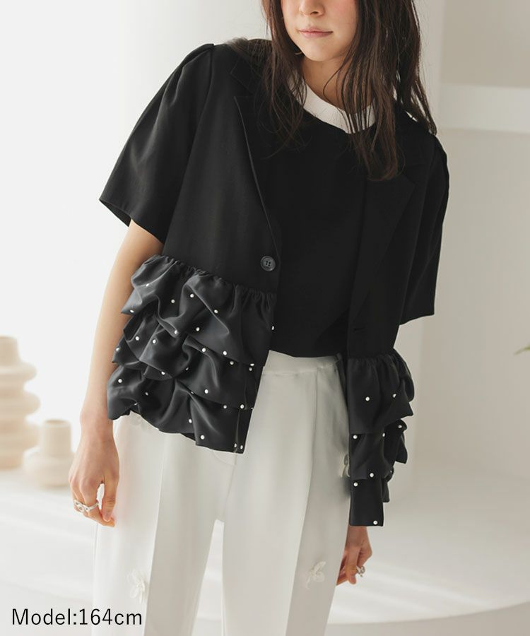 フリルジャケットは羽織るだけでいつものスタイリングに品をプラスしてくれるアイテム。真夏の冷房対策としても◯程よい甘さがタイプです。