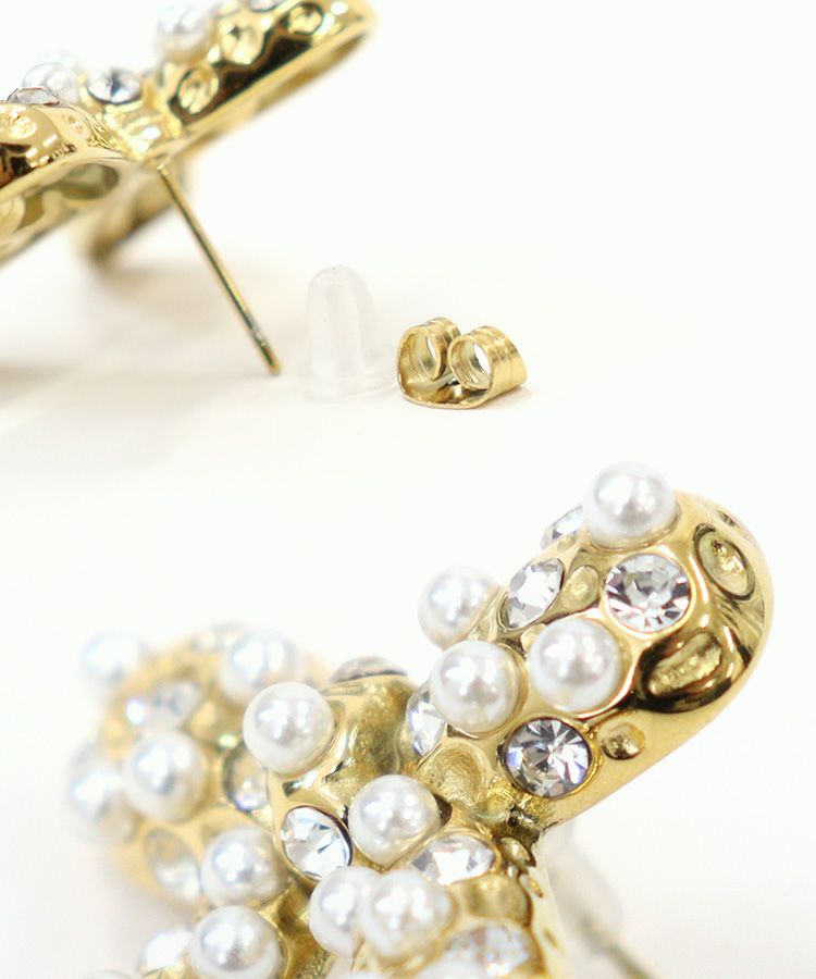 大ぶりなリボンモチーフに、パールとビジューを散りばめたピアス。