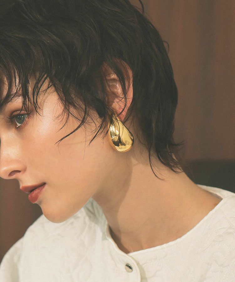 シンプルコーデも格上げしてくれる大きめのピアスは、光沢のある質感が顔まわりを華やかに演出してくれます。