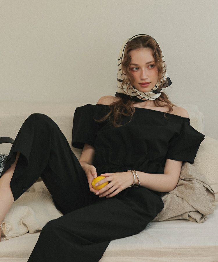 リラックス感のあるシルエットが魅力の撥水ハイウエストパンツにpufeのアメスリを合わせて大人カジュアルに