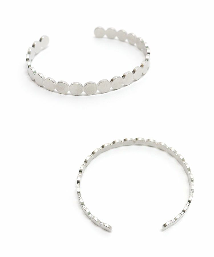 華奢で繊細なバングルと、小さめなサークルモチーフのバングルが3本セットになっております。