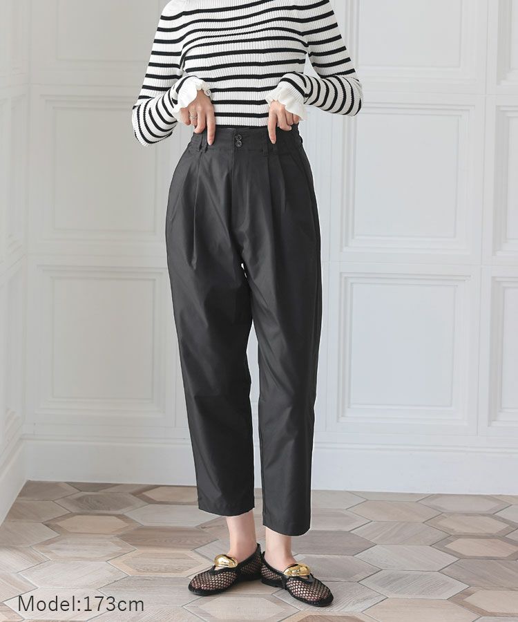 シルエットが抜群に良い撥水ハイウエストパンツは、綺麗めなコーデからカジュアルなスタイルまで着回せれる優秀パンツ。 ボリューム感のあるブラウスをインして、スタイルアップして見えるコーデ。