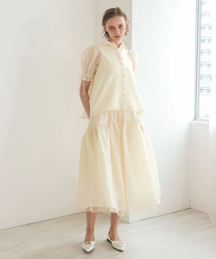 重く見えがちなモノトーンコーデを肌見せと生地感で爽やかに見えるよう合わせました。動きでキラキラ見えるスカートがポイントです。
