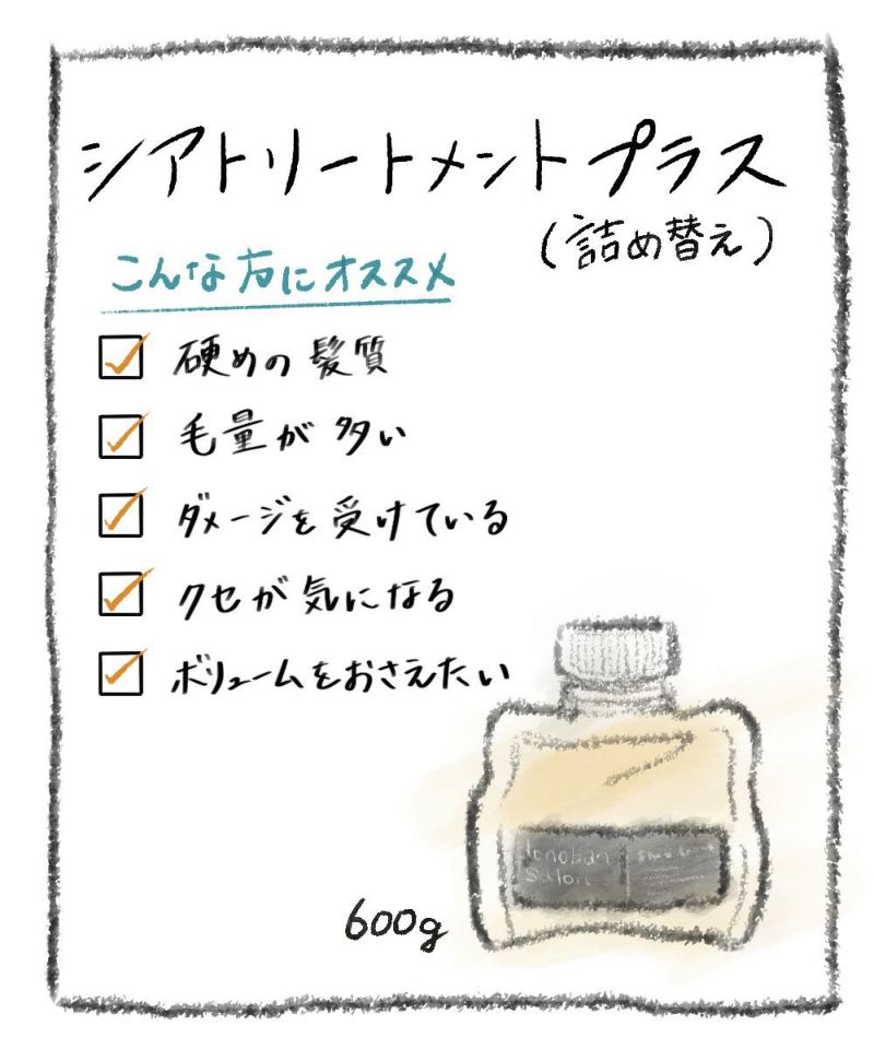 何度もリピートしてます。 重ためのトリートメントですが、しっかりしていてパサつきやすい髪質の私には合っています。最近詰め替えるのを忘れて子供たちが使っている市販のトリートメントを使っていますが、毛先がパサついてます。やっぱりこれじゃないとダメだなと実感してます。