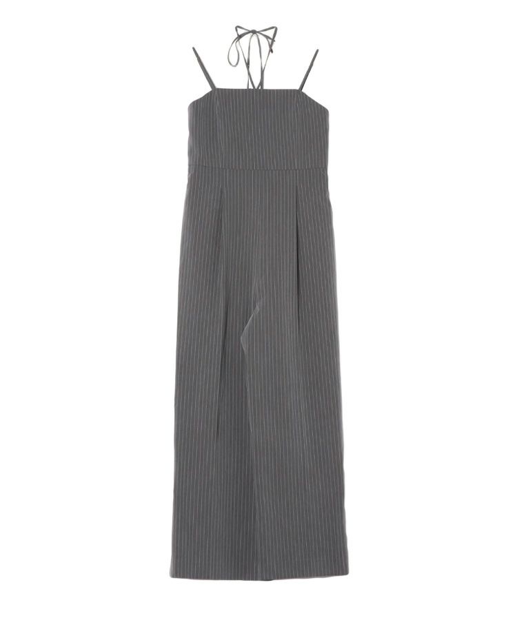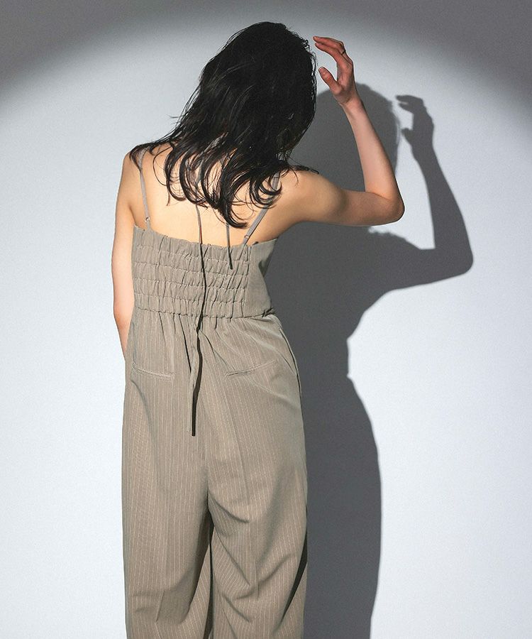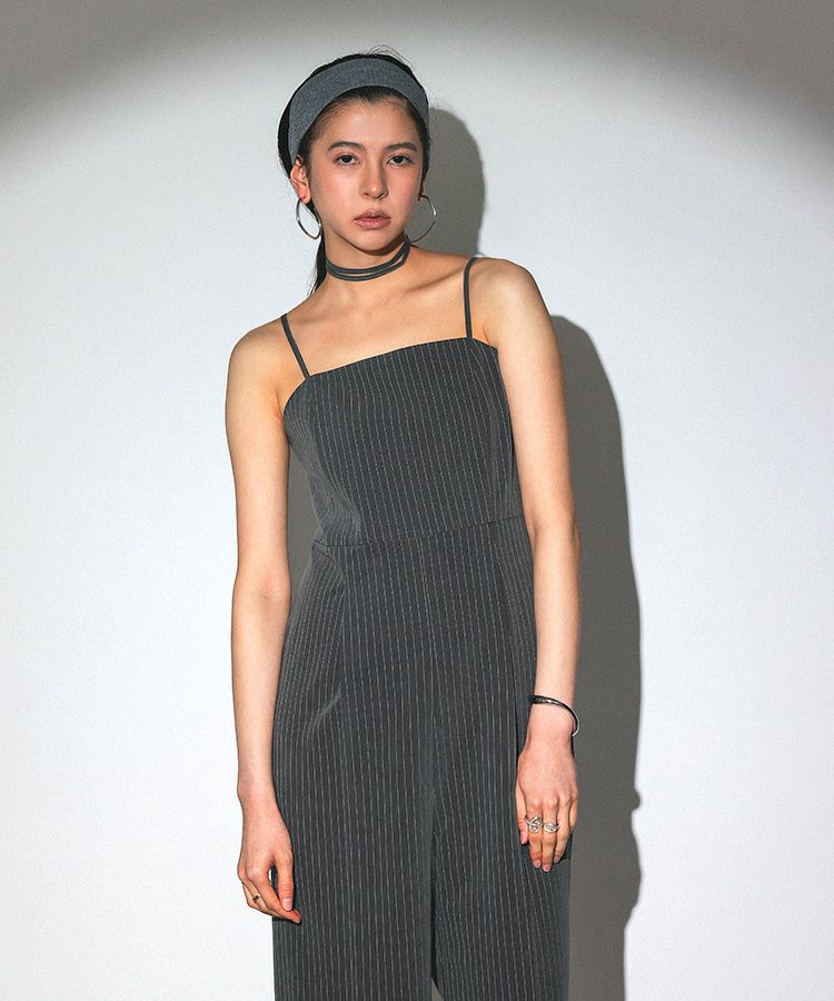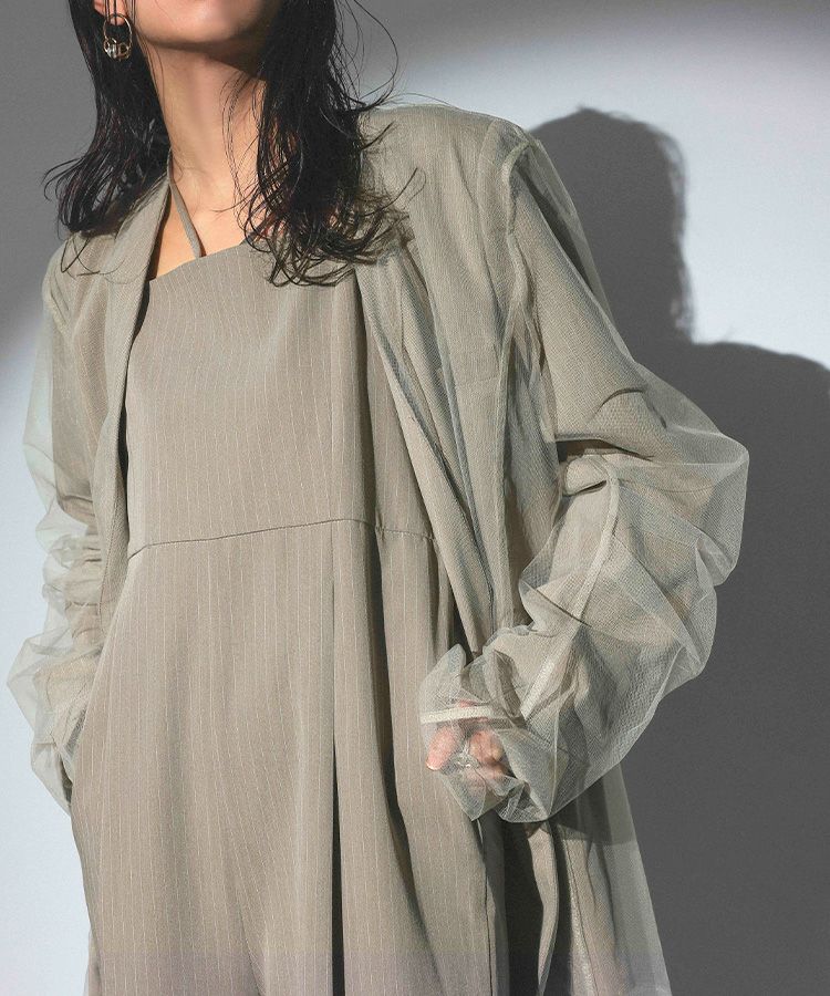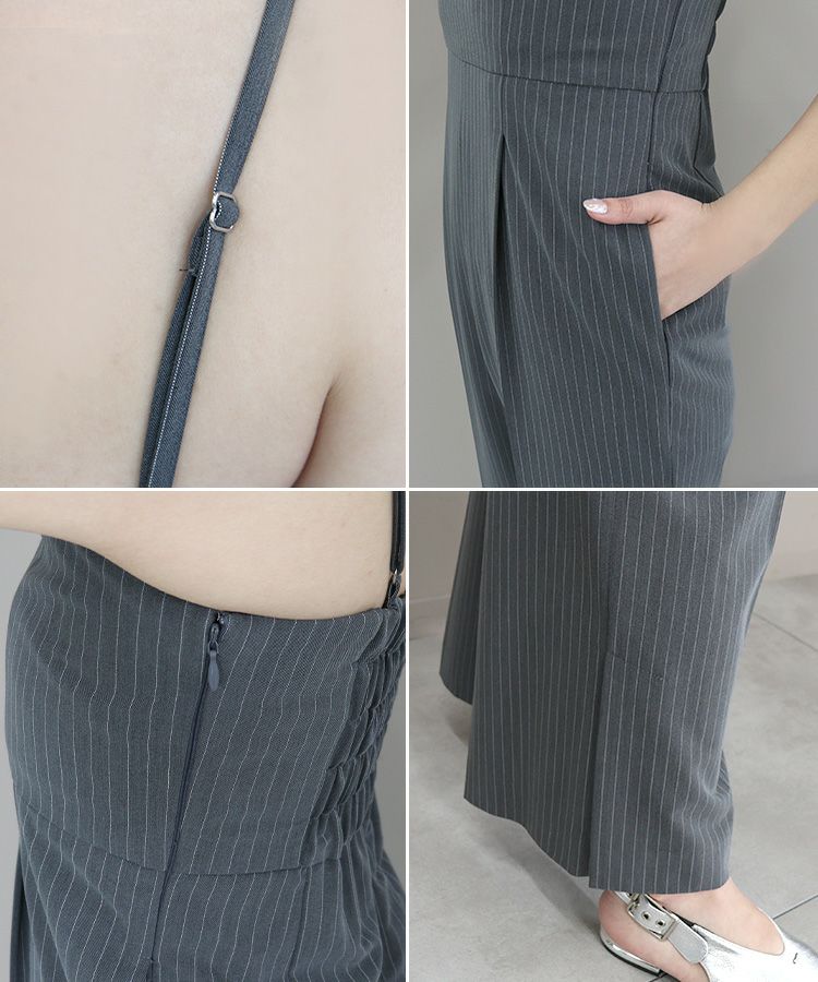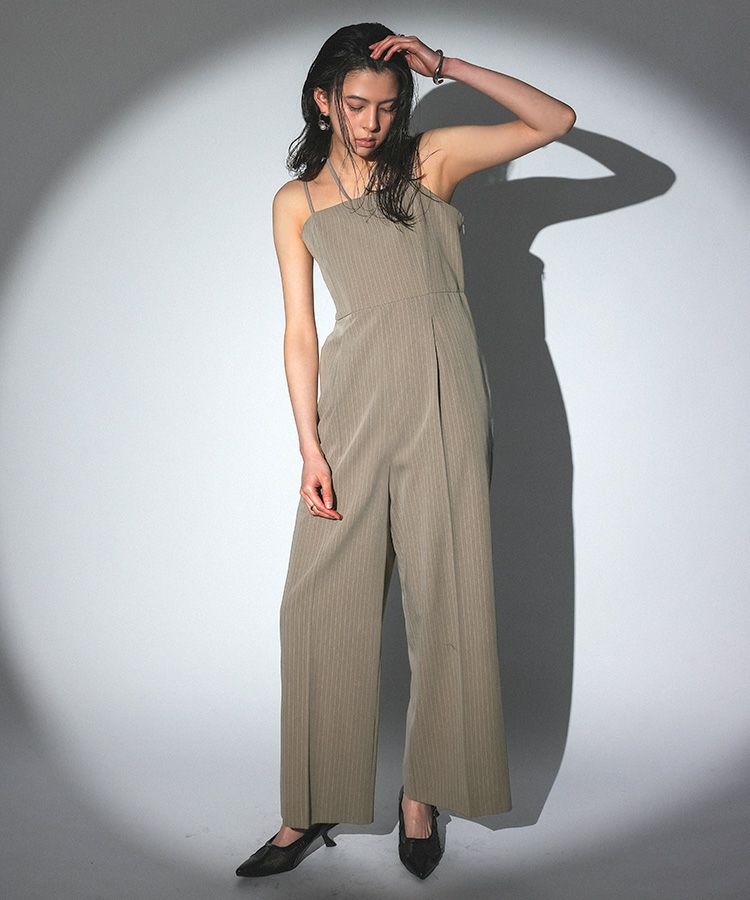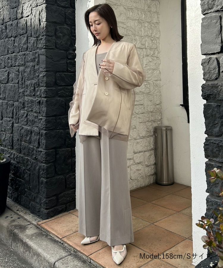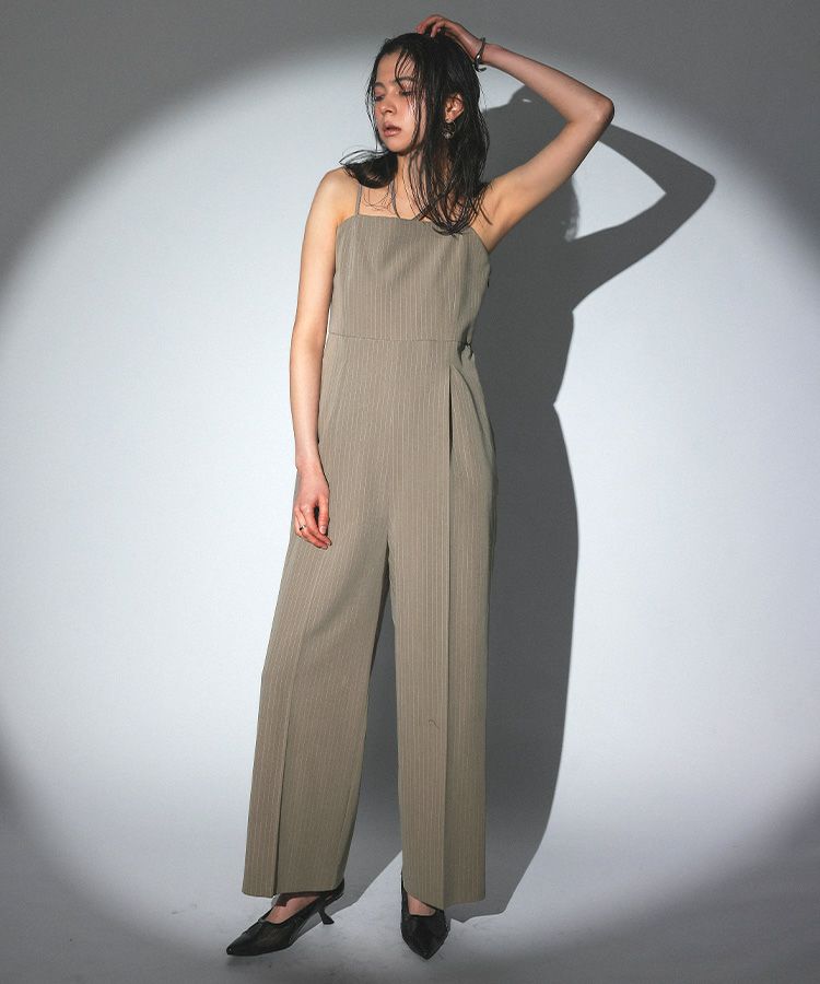 マニッシュなイメージの、ポリエステル×レーヨンのピンストライプ素材を採用。
