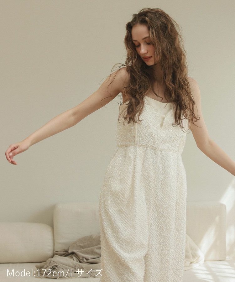 毛足のあるカットジャガード素材を使用した、繊細でニュアンスのあるキャミオールインワン。