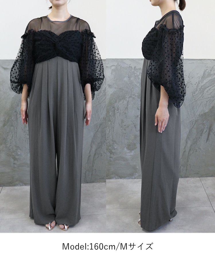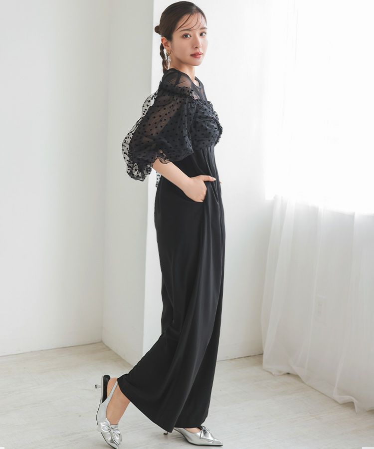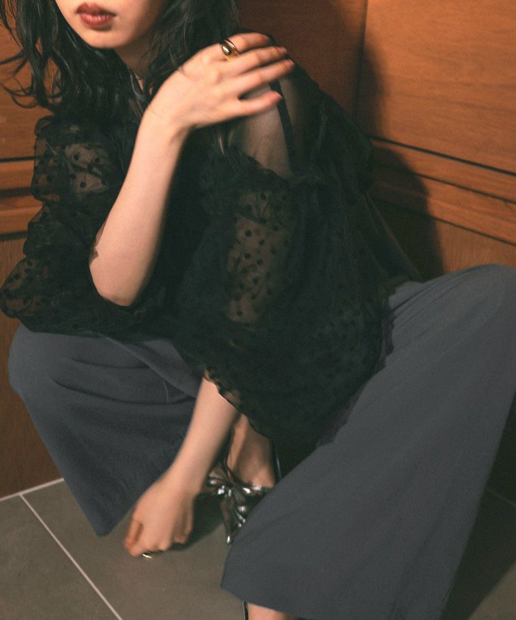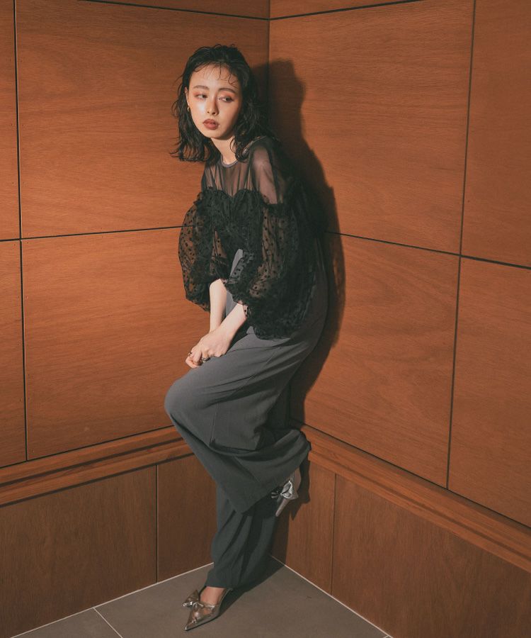 ふんわり軽やかなチュールを纏ったボリューム袖がファッショナブルな印象になり、デコルテや肩周りはチュールのシアー感を出して抜け感もプラス。