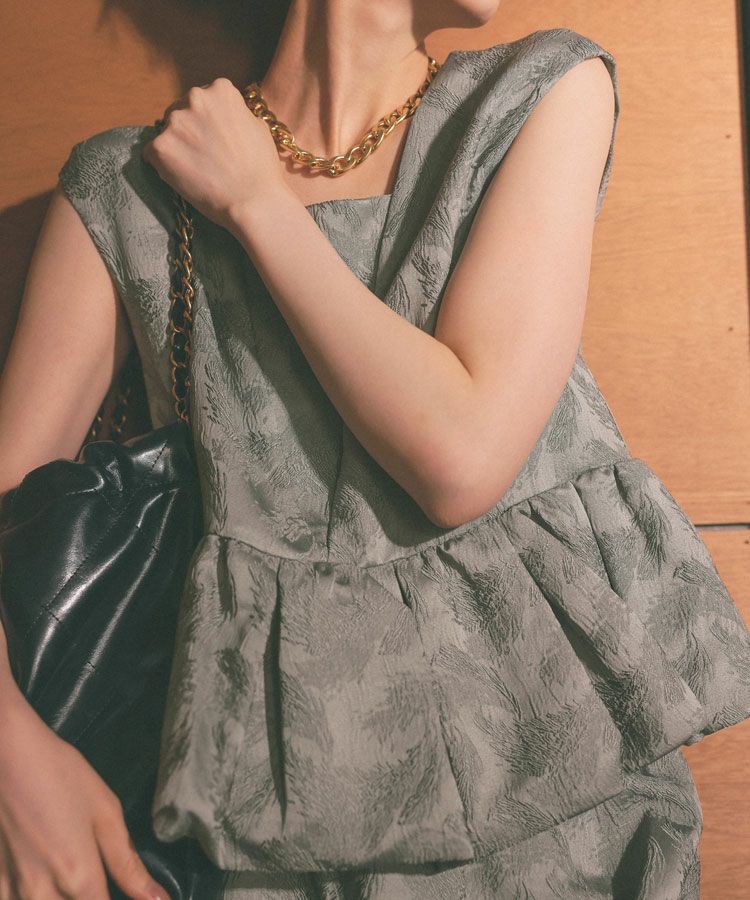 スタイルアップして見える理由でもある"ボリュームのあるペプラム"が動きに合わせて揺れるのも魅力。