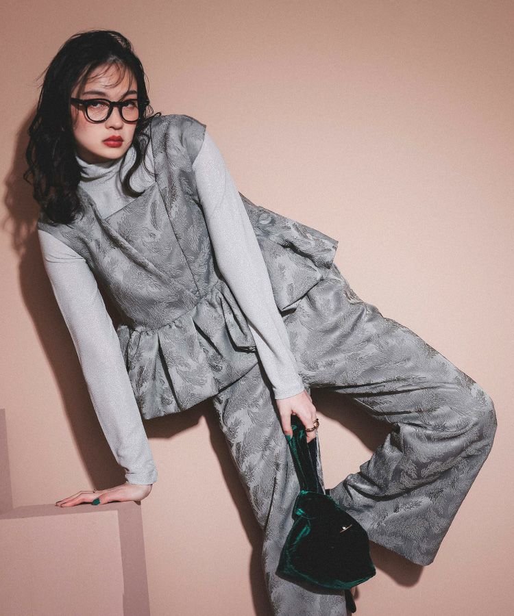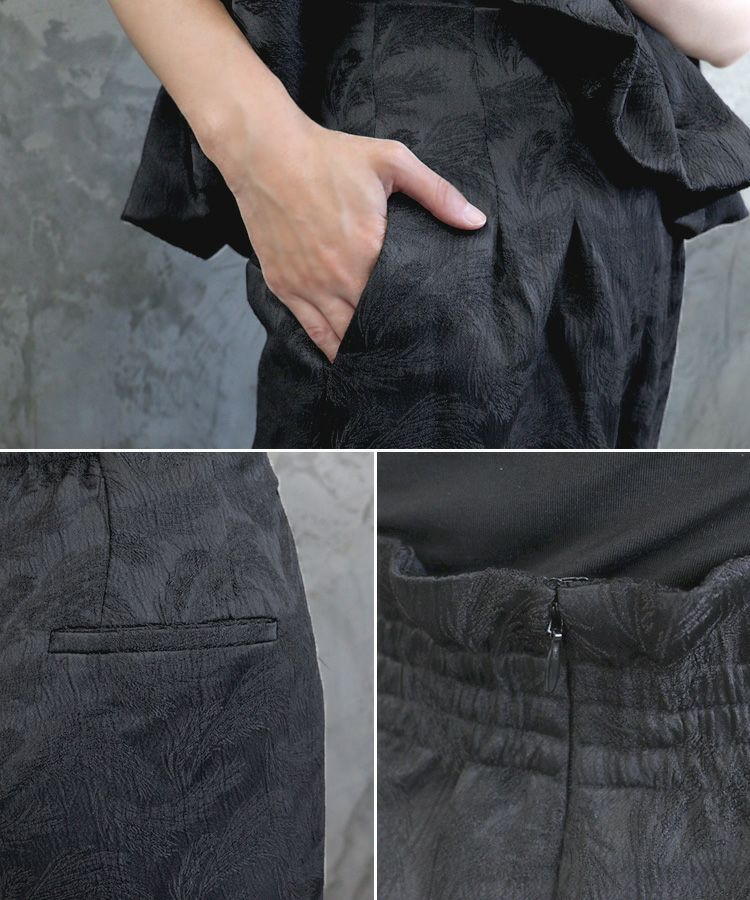 モードで大人なムードに仕上げた、フェザー柄のジャガード素材のパンツセットアップ。