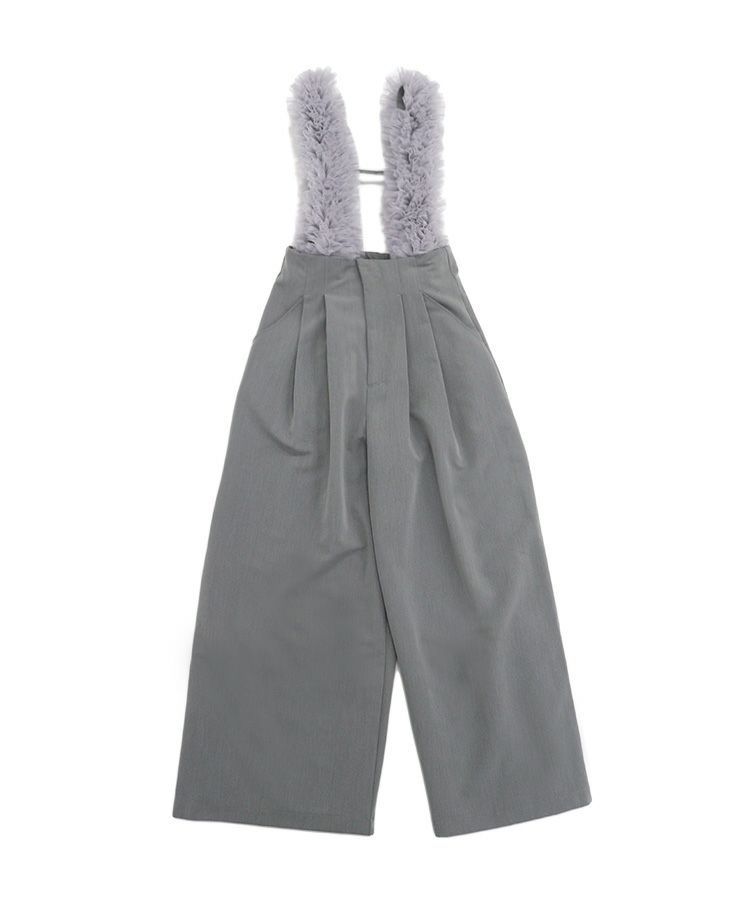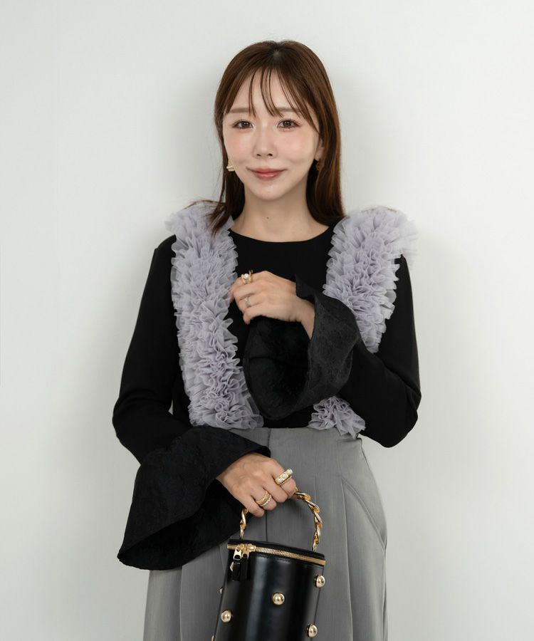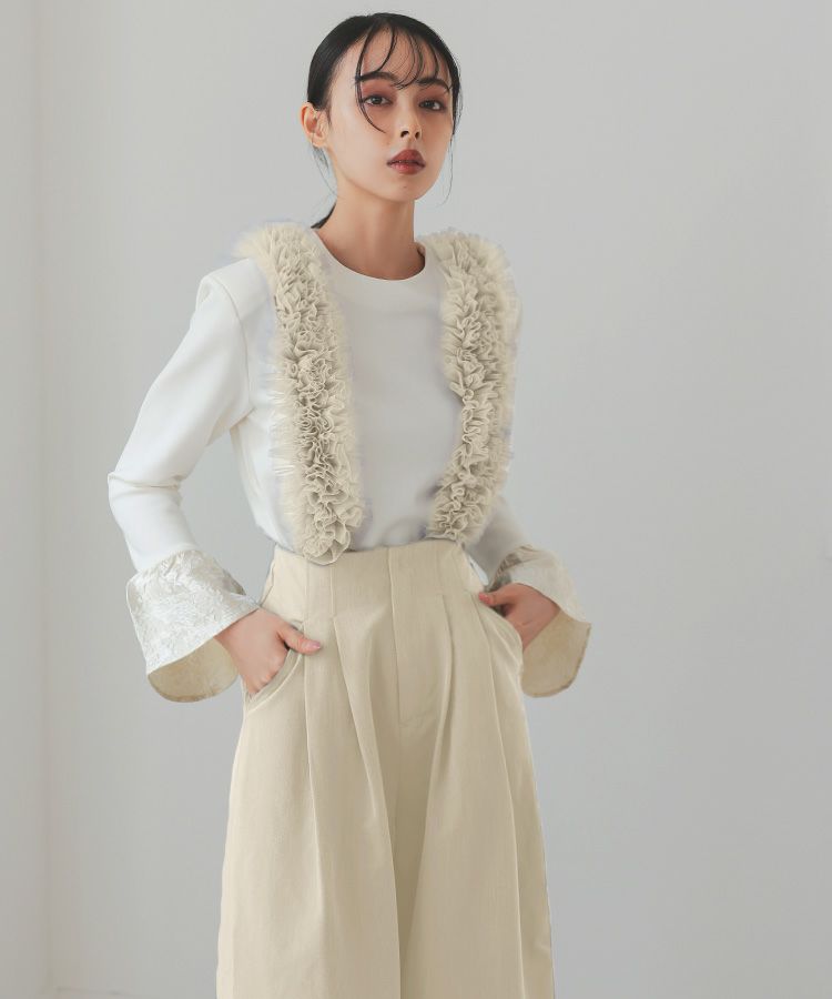 まきさんコラボのチュールフリルサスペ付きハイウエストワイドパンツをサスペンダーを取ってフェザーペプラムトップスと合わせてみました。 このワイドパンツは形が感動するほど綺麗で脚長効果抜群!