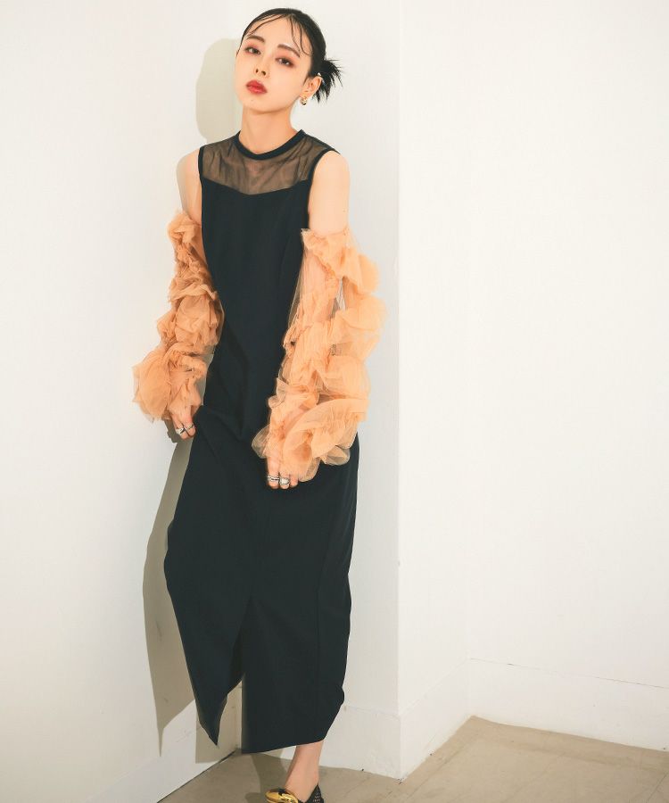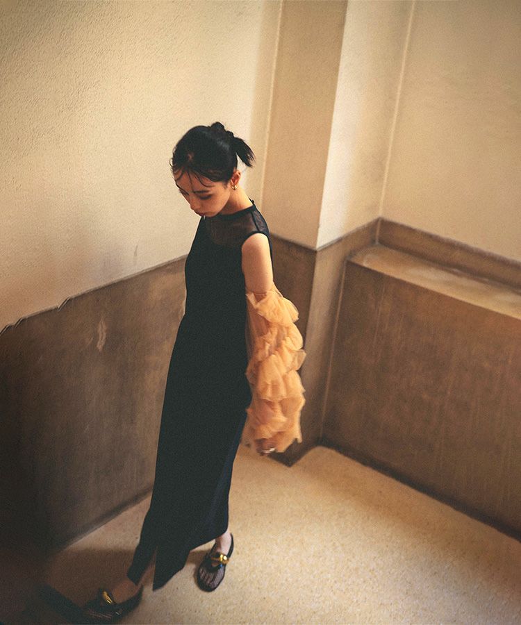 合わせるワンピースはシンプルなデザインに抑えて、ボリュームスリーブがより際立つバランスに。