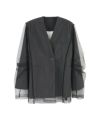 ポリエステル×レーヨンのピンストライプ素材とハリ感のあるチュール素材をレイヤードした、ボクシーなカラーレスジャケットです。