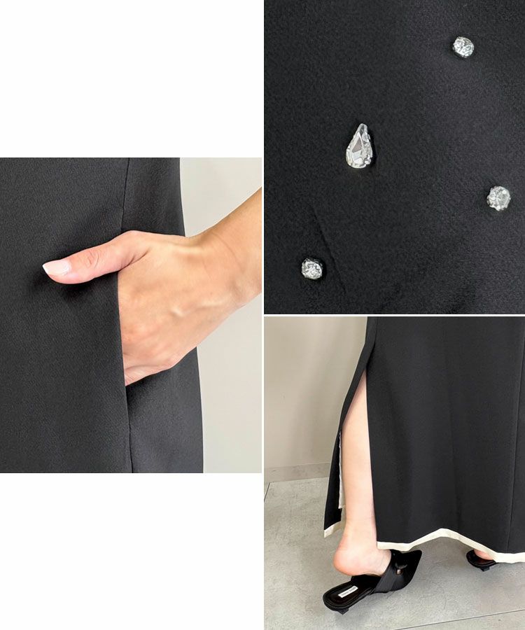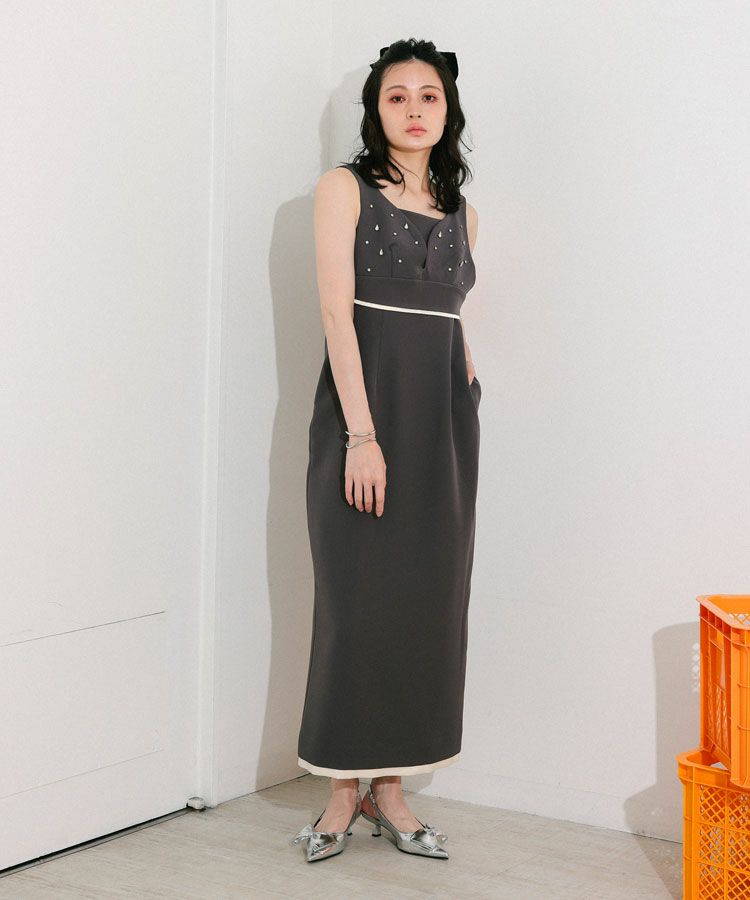 ビスチェ・ワンピ―スともに裾から覗くサテンの光沢が、ドレッシーで艶っぽいアクセントとして、全体の雰囲気を引き上げる。
