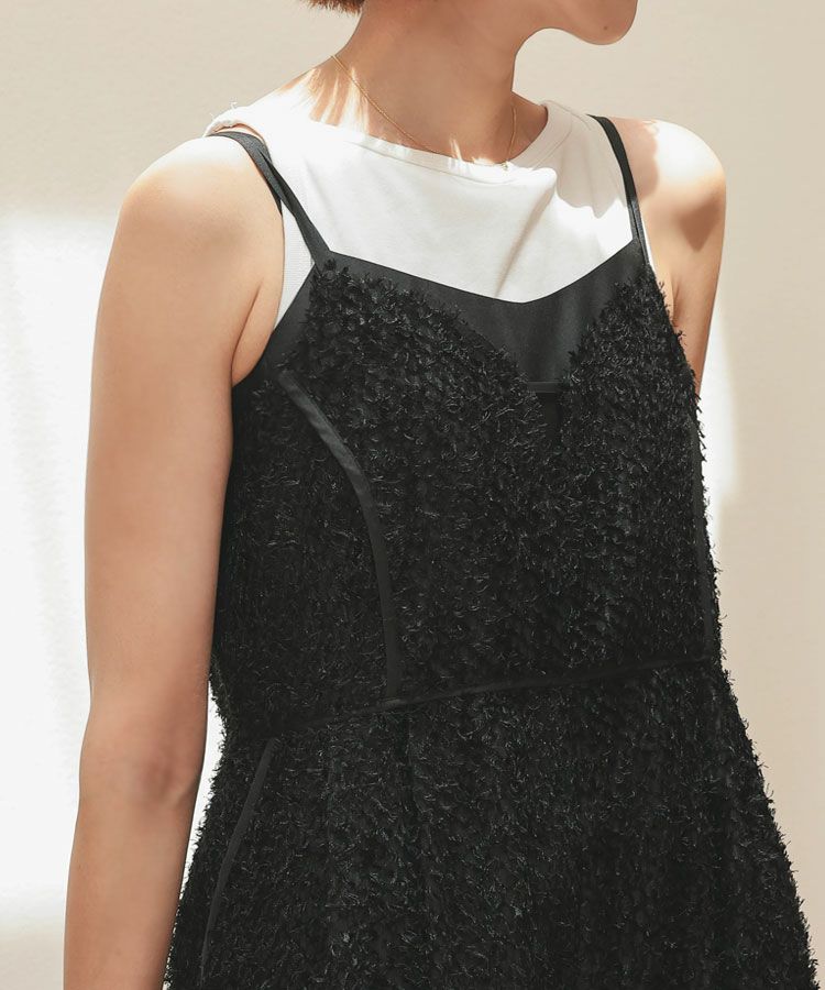 毛足のあるカットジャガード素材を使用した、繊細でニュアンスのあるキャミオールインワン。