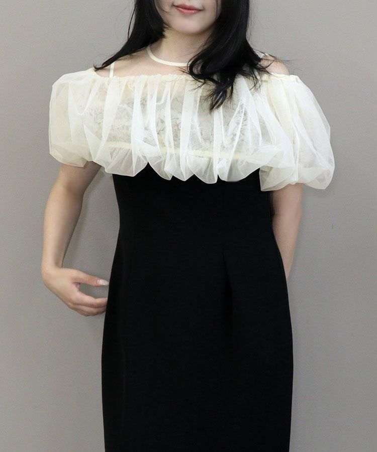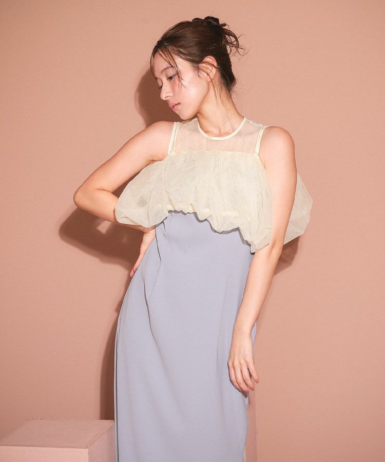 チュールを重ねて作ったバルーンフォルムトップスとミニマルワンピのセットアイテム。