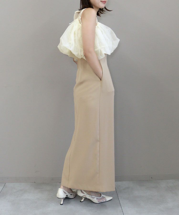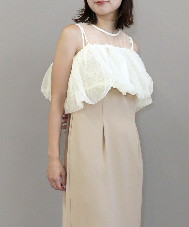 シアーでドライな質感のチュールと、ドレッシーな合繊生地を使用。